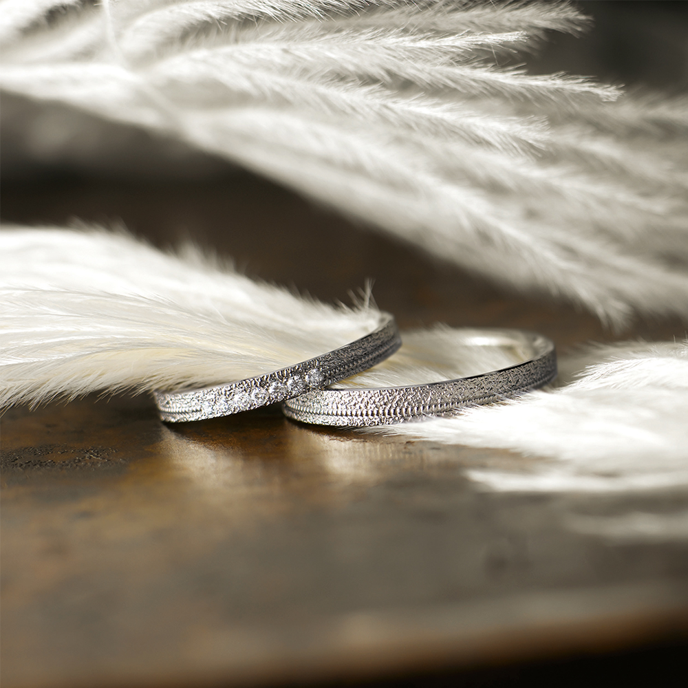 天使の羽をイメージした模様やアンティーク調のミルグレインが施されたリングです。模様をリングに転写するローレット加工は、高級文具の持ち手部分の装飾に使われる技術。パイロットならではの技から生まれた優雅で美しいデザインです。