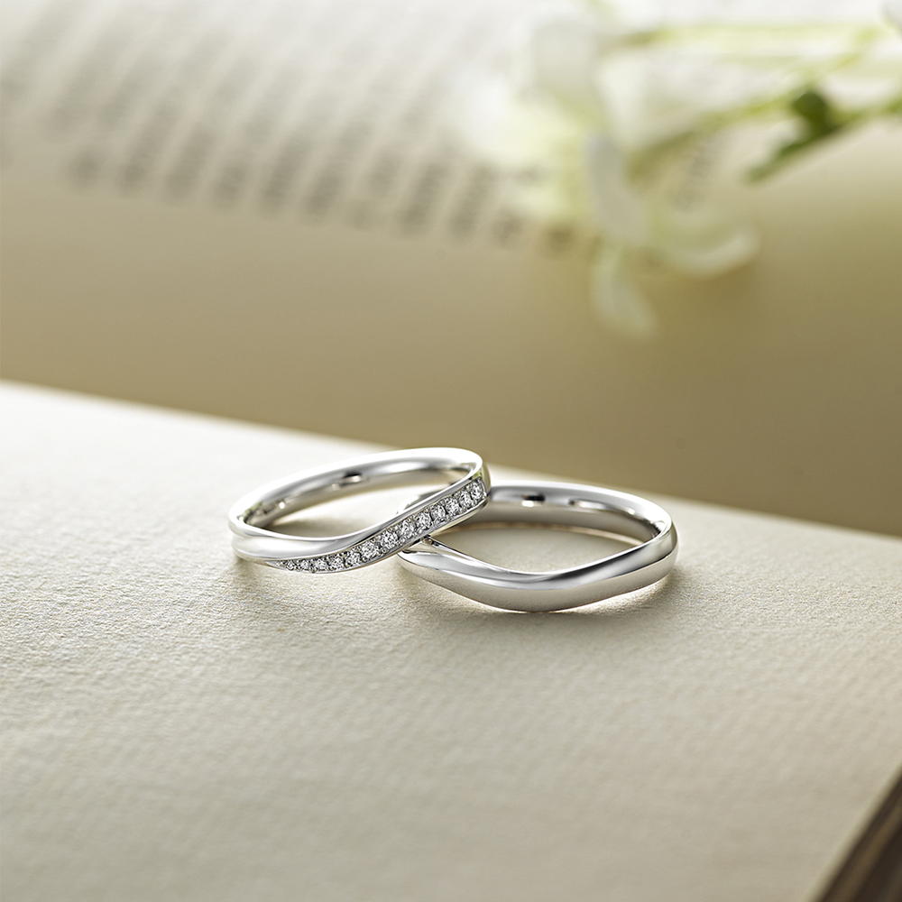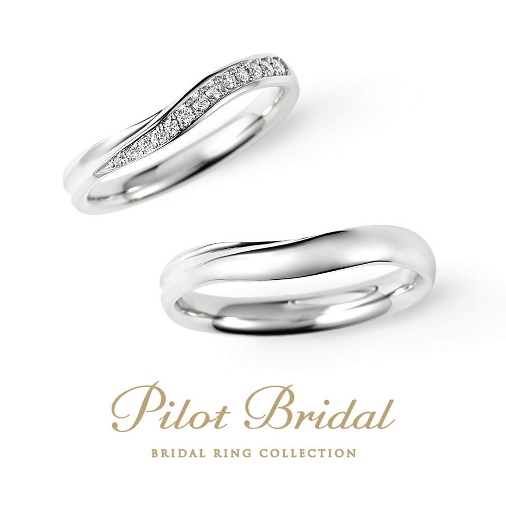 柔らかなVラインのデザインは、マリッジリングの新定番。指が長く美しく見えると人気があります。パイロット独自の特殊な金型で型押しするため、着け心地をそこなうことなく流れるような美しいラインに。零れ落ちるようにダイヤモンドをあしらって可憐な印象に。