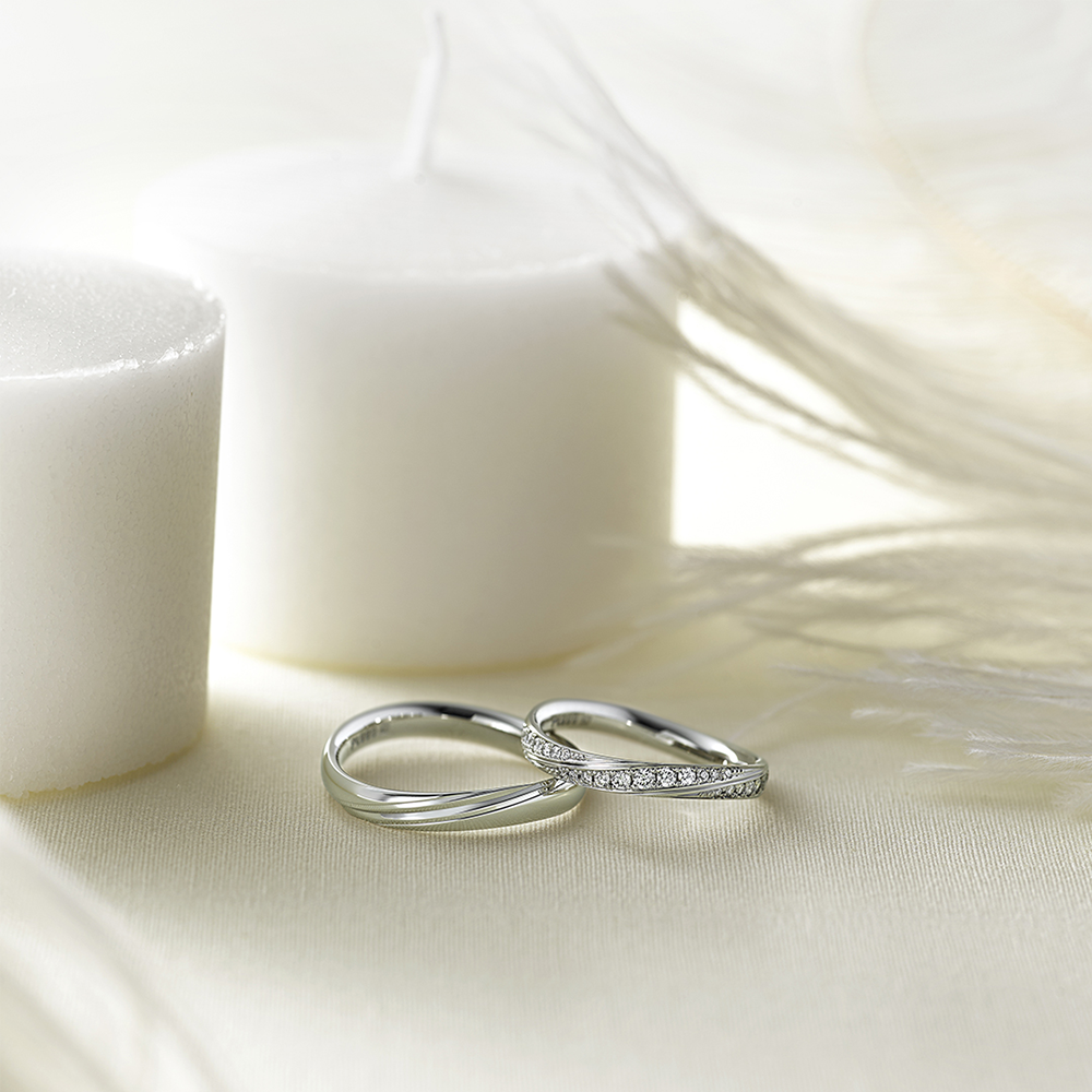 ゆるやかなウェーブラインは、グラデーションにセッティングされたダイヤモンドがグラマラスに輝きます。サイズのばらつきや金属のひずみが起こりがちな曲線ラインのリングですが、パイロット独自の特殊な金型で型押しするため着け心地をそこなうことなく流れのある躍動感のあるリングへ。