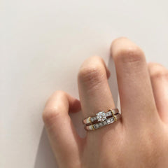 イングリッシュガーデンをテーマにクラシカルなデザインに仕上げた《ロゼット》のブライダルリング。 指輪ひとつひとつに冠されているのは「しずく」「月あかり」「花冠」「小枝」など、自然をモチーフにした名前。 それぞれのデザインに秘められた物語が、 ふたりのラブストーリーをよりロマンティックに 彩ります。 “RosettE”はヨーロッパで古くから伝わるリボンの勲章のこと。尊敬と愛を込めて贈り合うロゼットは、ブライダルリングにふさわしいテーマといえるでしょう。