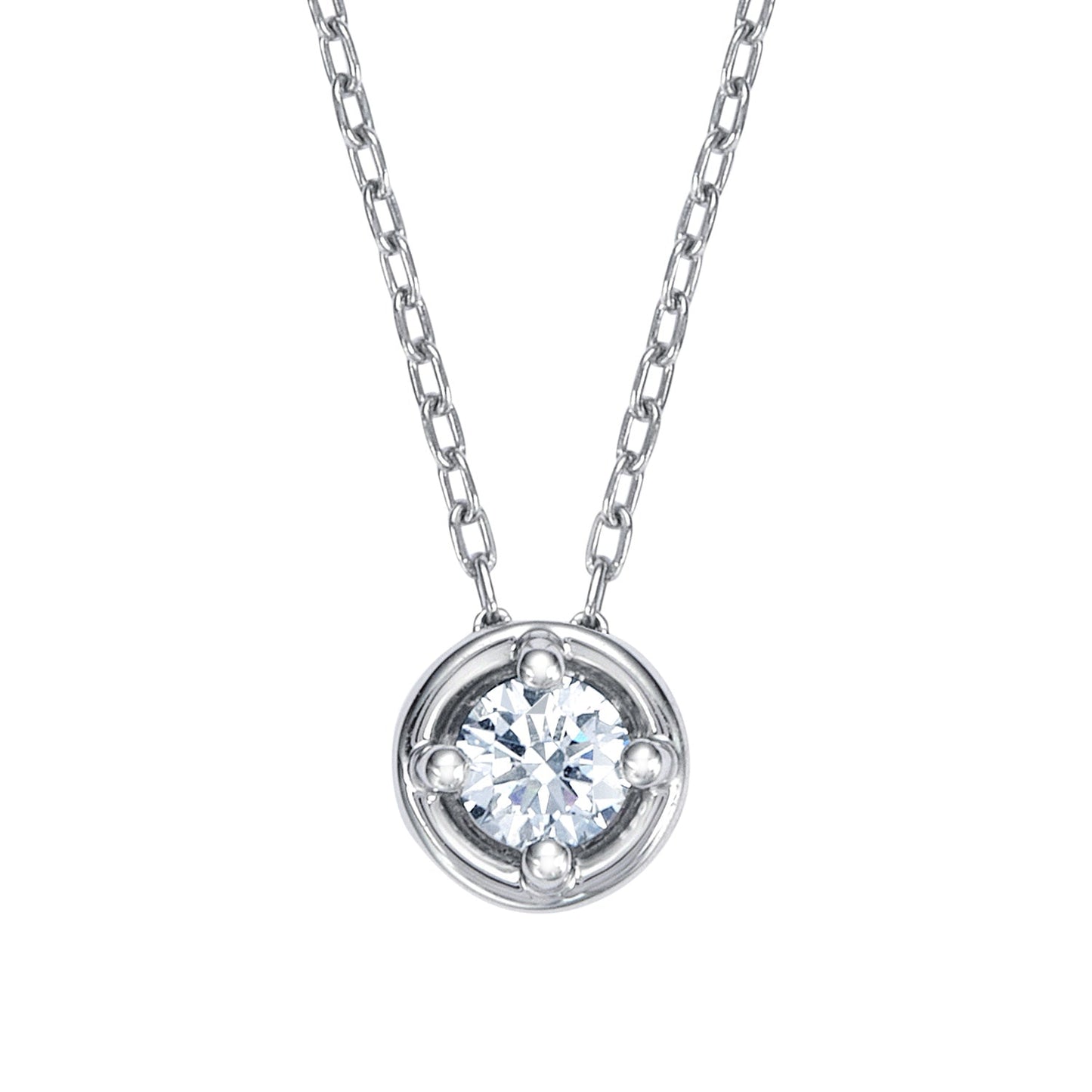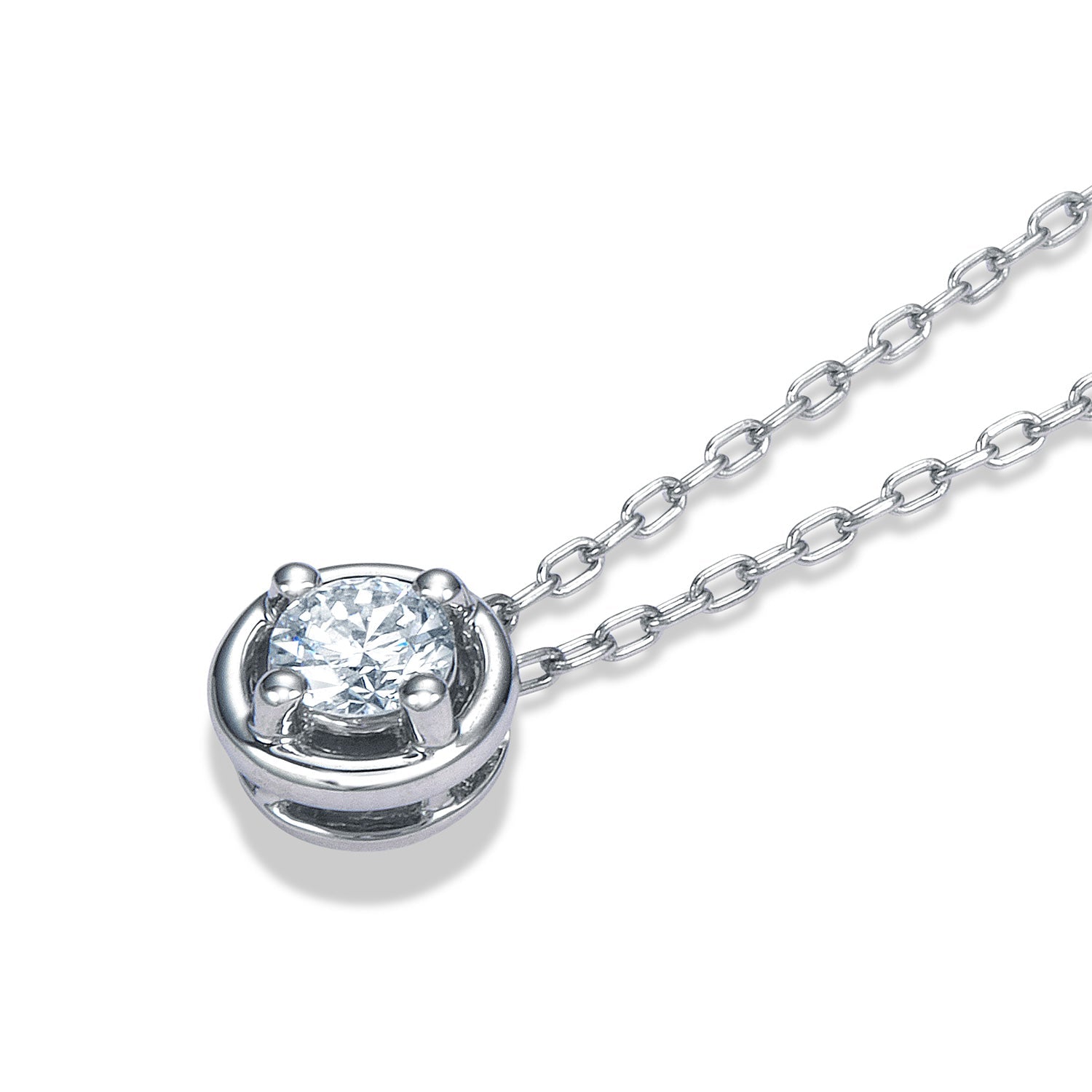 シーンを選ばずに身につけられるミニマムなペンダント。ダイヤモンドの周囲をプラチナが包むようなデザインは、石をより大きく見せる効果があります。