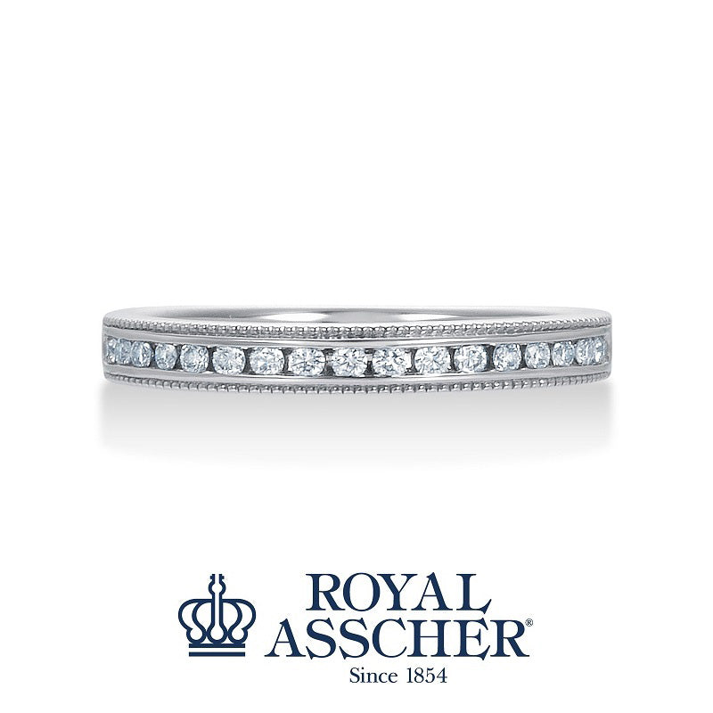 人気のレール留めの枠にミルグレインを施したデザイン。マリッジリングとのコーディネイトも楽しめます。