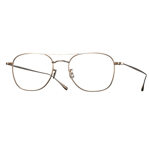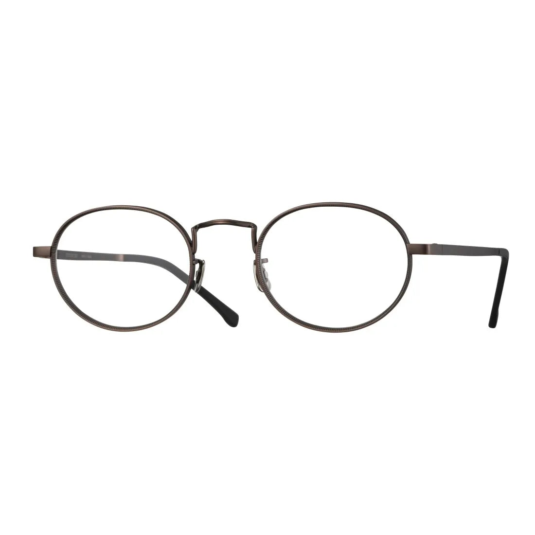 その時代を象徴するようなオーバル型のレンズシェイプとややワイドなメタルテンプルが特徴的。リムは2019AWモデル[215]で開発した“TV-RIM”を採用した。ブラウン管のTVから着想を得て製作したこのパーツは、リム内側の傾斜部分に0.2mmピッチのラインを刻印するという非常に製造難易度が高いもの。カラーコードc.922/ANTIQUE BROWNもその着用モデルから色味をサンプリングし、熟練した塗装職人が色調を入念に再現した。