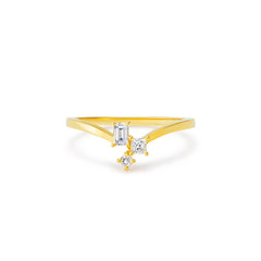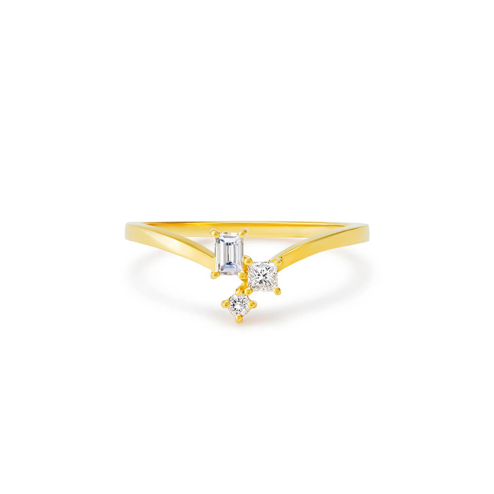 バゲットカット、プリンセスカット、ラウンドブリリアントカットの3つの異なるカットのダイヤモンドの調和が、手元に豊かな表情をもたらします。また、繊細なV字ラインに添うようにダイヤモンドをセッティングしたデザインが柔らかい印象を与え、指を美しく演出します。