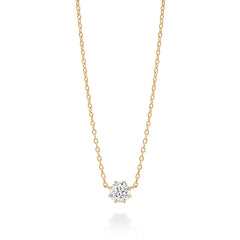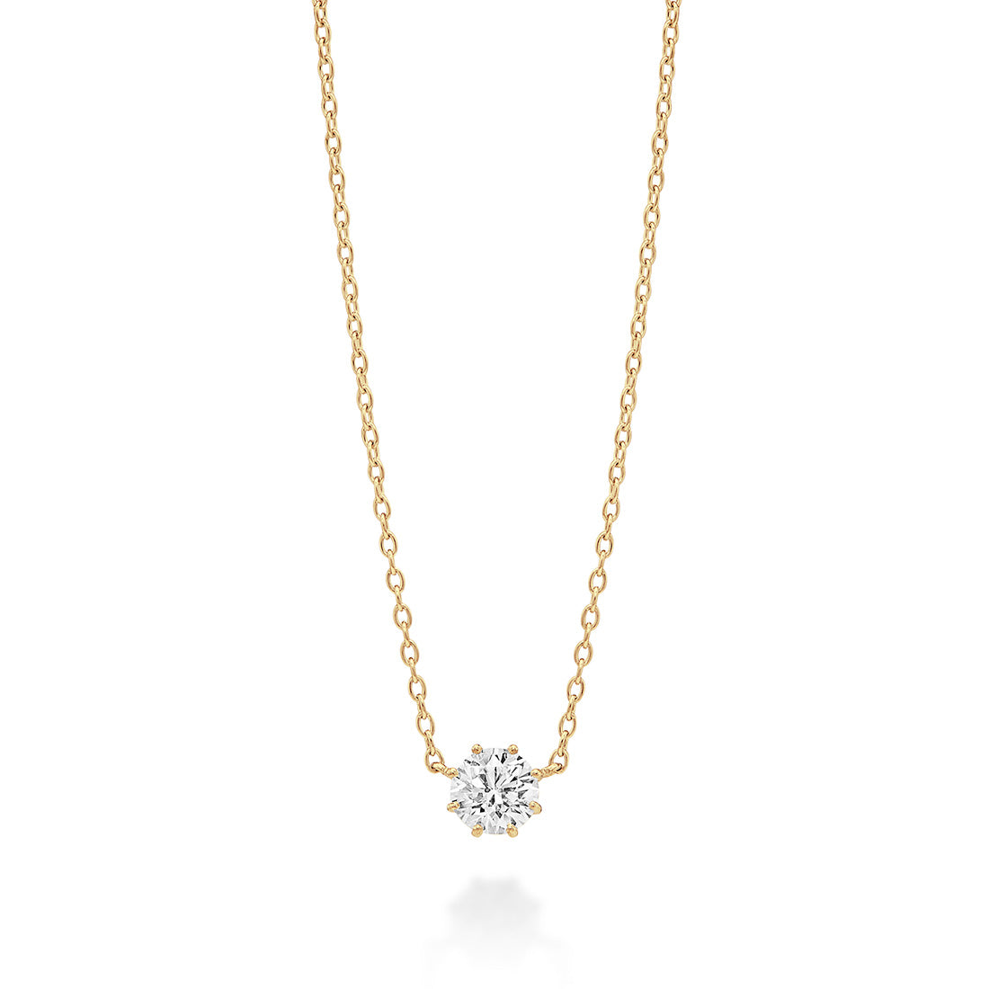一粒ダイヤの美しさを最大限際立たせた、シンプルで繊細なネックレス。ソルティアラウンドネックレスよりひと回り大きなダイヤモンドを使用し、ダイヤの輝きを邪魔しないごく小さな爪でセッティングしています。 ハートやクロス、イニシャルといったパヴェシリーズのネックレスや、ビリーブユーネックレスとの相性も良い、時代や年代を問わず永い時間愛用できるデザインです。