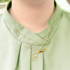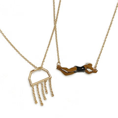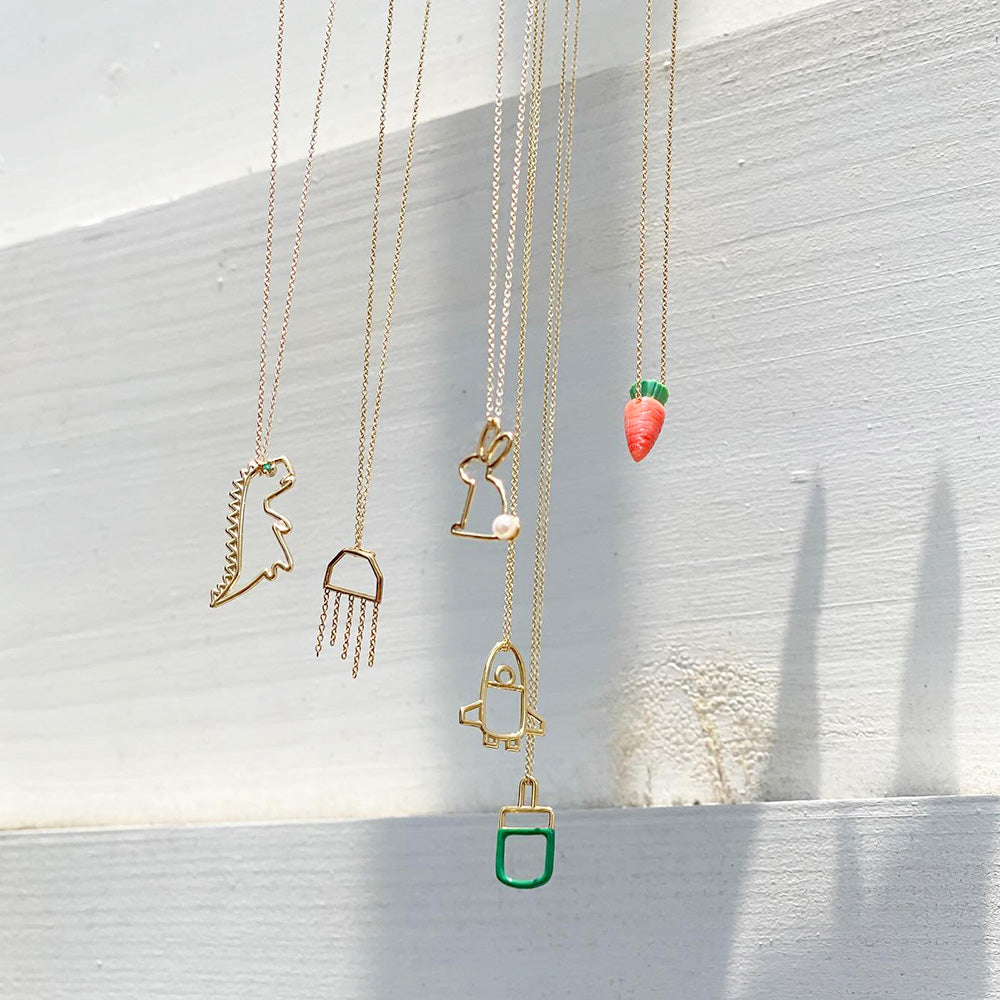 着用例のように、クラゲとスイマーのネックレスでの重ね着けなど、ユーモアあふれる物語を演出できます。ぜひお気に入りの物語をアリータのジュエリーで表現してください!