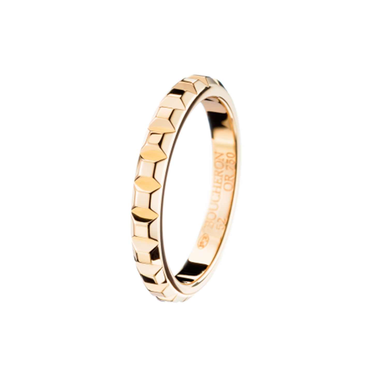 ブシュロンを象徴するモチーフ「クル ド パリ」は、光の都パリのロマンティックなエスプリと、ヴァンドーム広場の石畳を表現しています。 ゴールドに施された巧みな彫刻が光をとらえ、ダイヤモンドのようなきらめきを放ちます。 まるで二人の絆を称えるかのように、明るい輝きで永遠の愛を祝福するリング。