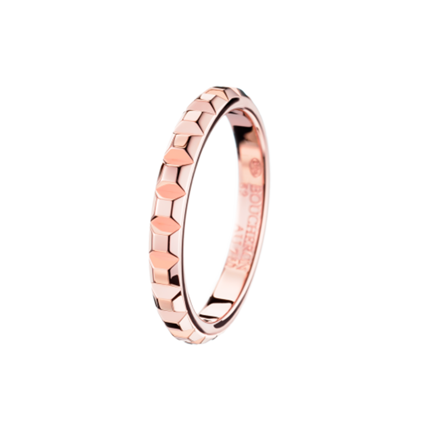ブシュロンを象徴するモチーフ「クル ド パリ」は、光の都パリのロマンティックなエスプリと、ヴァンドーム広場の石畳を表現しています。 ゴールドに施された巧みな彫刻が光をとらえ、ダイヤモンドのようなきらめきを放ちます。 まるで二人の絆を称えるかのように、明るい輝きで永遠の愛を祝福するリング。