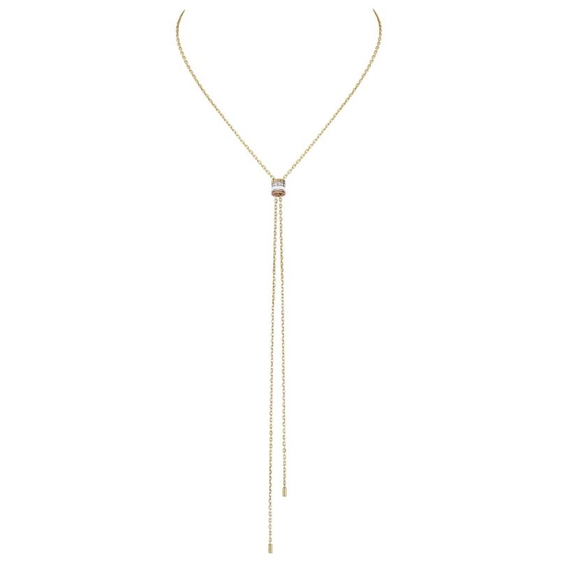 タイのように纏って、斬新なカットのシャツを引き立てたり、あるいはボタンダウンシャツの襟もとに通したり、自由なスタイルを楽しめるネックレスです。モチーフを下の方に滑らせてルーズに身に着ければ、小さめのコットントップスも一層魅力的に。あえてチェーンをアシンメトリーにさせれば、プレーンなニットもスタイリッシュな印象になります。また、チェーンを背中側に垂らせば、大きく開いた背中を美しく飾ることも。