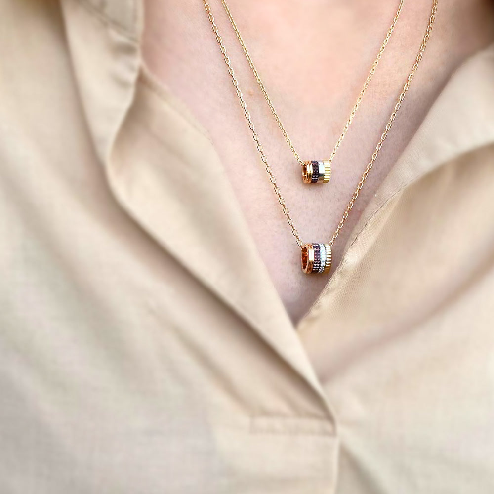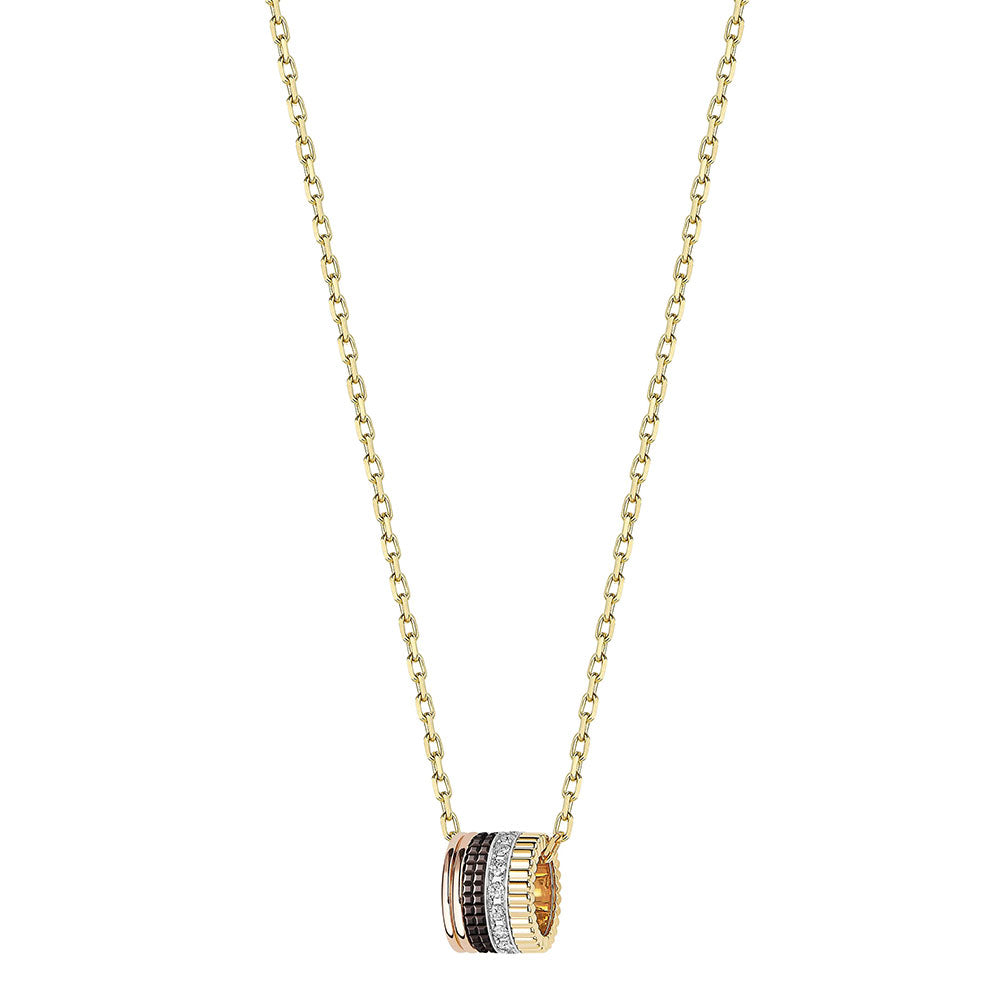 ブランドに継承される4つのコードを表現したキャトルクラシックのペンダント。イエローゴールド、ピンクゴールド、ブラウンPVDそしてホワイトゴールドにパヴェセッティングされたダイヤモンドのラインが組み合わされたペンダントトップが、繊細なチェーンの先で美しく煌めきます。