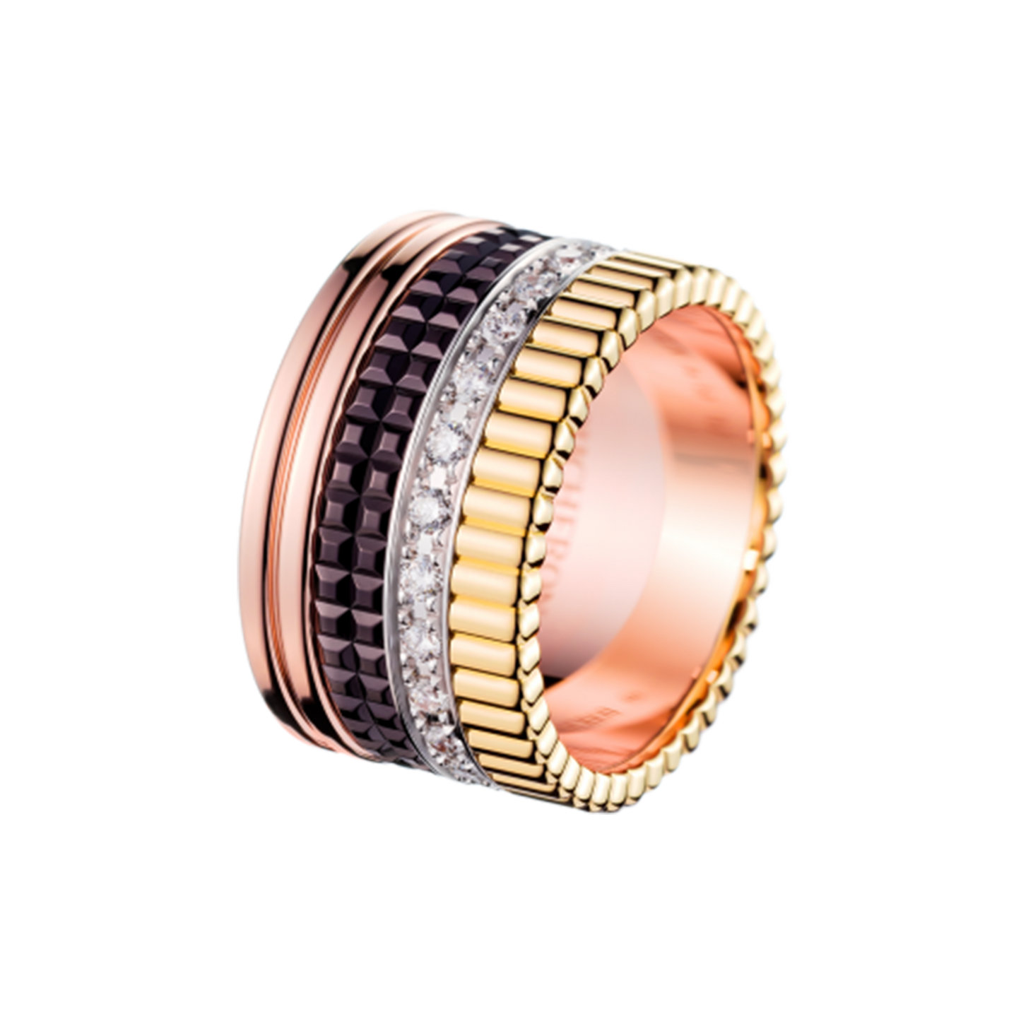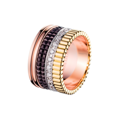 異なるゴールドとテクスチャーの斬新なコンビネーション。ブシュロンを代表するキャトルは、メゾンの伝統的なモチーフを再解釈し、新たな息吹を与えたコレクションです。 精巧にミラーセッティングされたダイヤモンドは、 リングに煌めきと美しさを与えます。 確固たるモダニティと優れたクラフツマンシップによる新しい調和を体現するキャトルは、身に着ける人のスタイルを際立たせます。