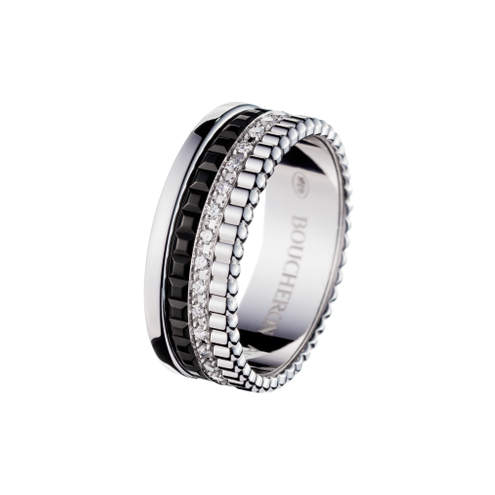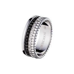 ブシュロンのエスプリが刻まれたキャトル ブラック リングには、メゾンを象徴するモチーフが表現されています。 ホワイトゴールドの美しさを際立たせ、まばゆいコントラストを生み出すピュアで力強いブラックPVDと、独自のミラーセッティングにより最大の輝きを放つダイヤモンド。 流行にとどまらない魅力をもつリングです。