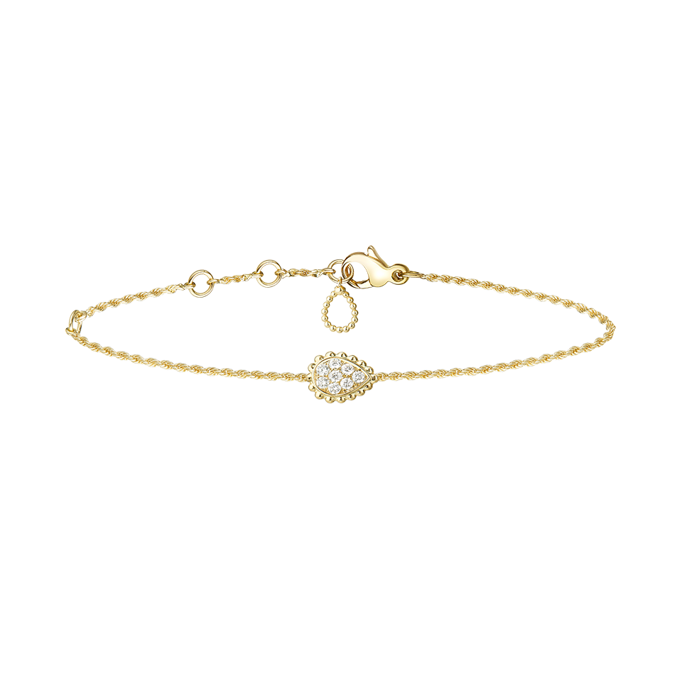 ブシュロンが再解釈したセルパンボエム ブレスレットは、この上なく繊細で、より女性的。 イエローゴールドの華奢なツイストチェーンは、ヘビの頭部のイメージから生まれたドロップモチーフを飾るダイヤモンドを際立たせています。