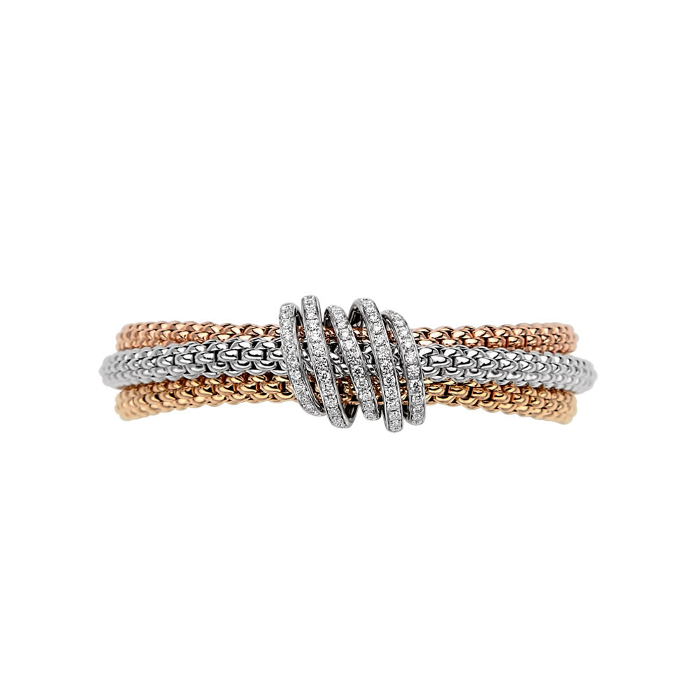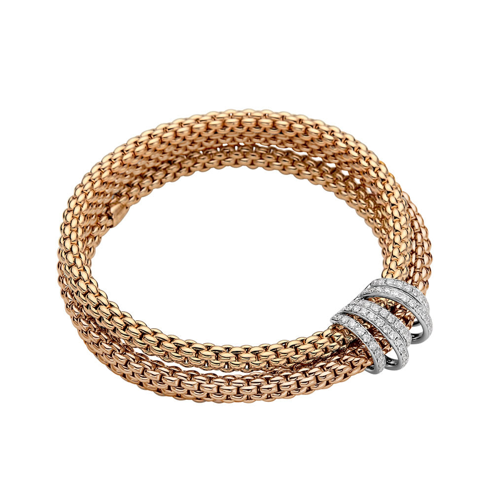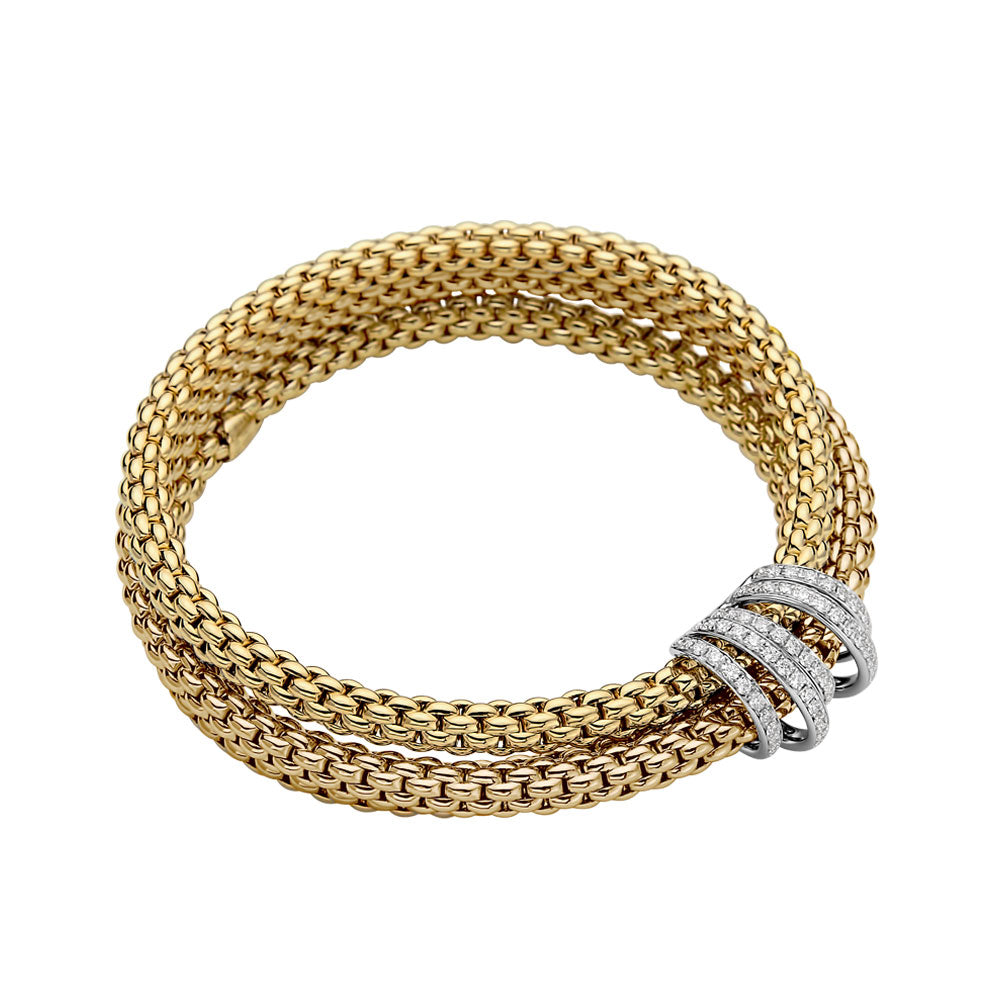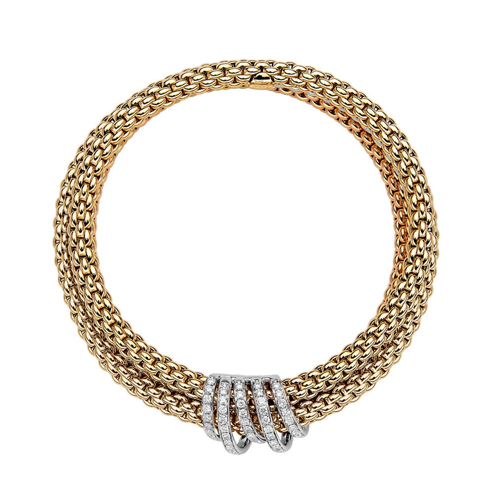 FOPEのベストセラーコレクションの一つであるSolo(ソロ)は、ゴールドのラウンドメッシュが特徴で、年齢や性別を問わず人気があります。2010年から展開する多彩なバリエーションは、現代的なスタイルを具現化する新たなデザインの発表によってさらなる魅力を放ちます。今回のSolo(ソロ)は新しいロンデルデザインを採用。より大きなカラットのダイヤモンドをクローセッティングすることで作品をより洗練されたものにし、光を受けてさらに美しく輝きます。