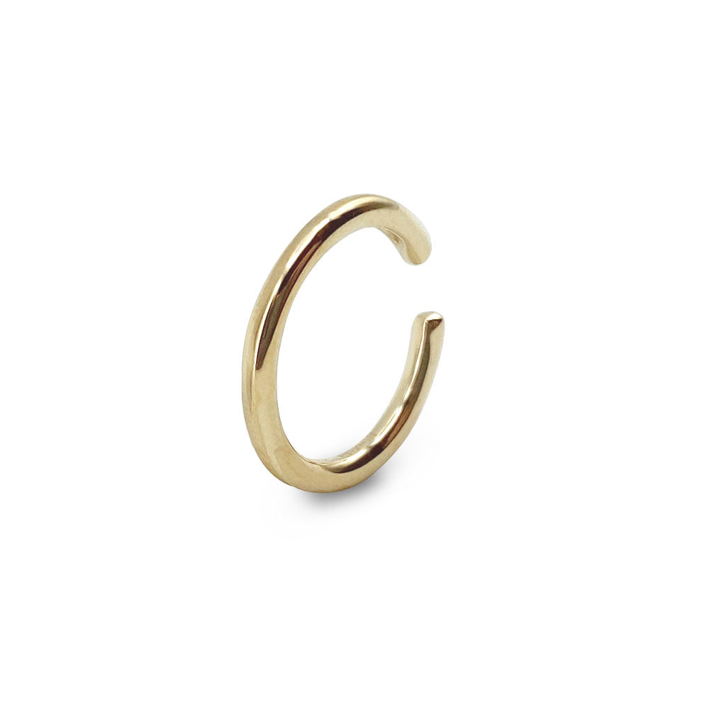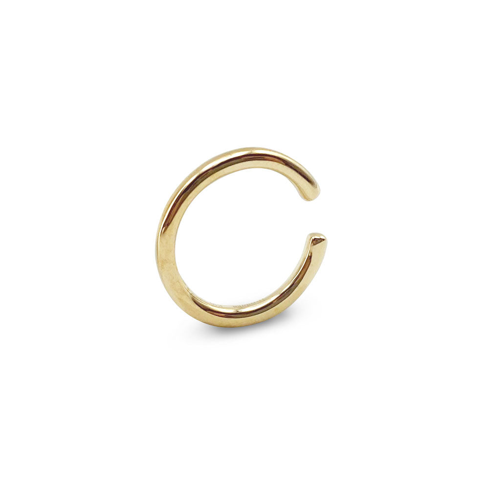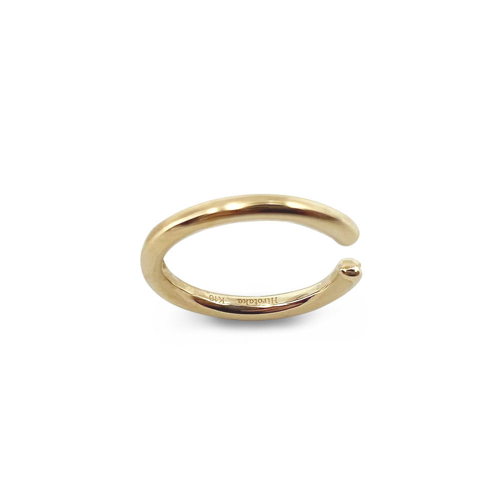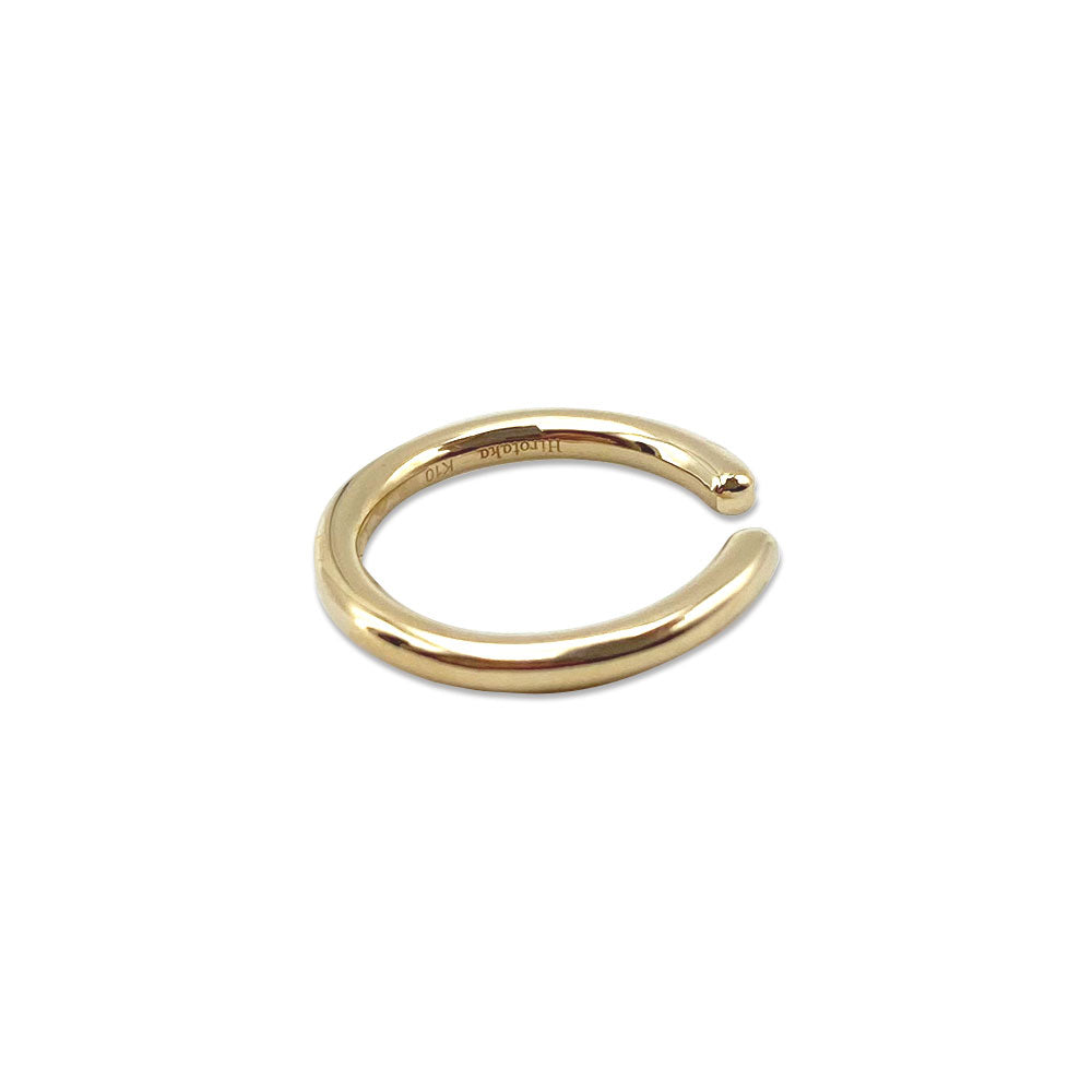 シンプルなイエローゴールドのイヤーカフ 。地金の半分に溝を刻むことで、より幅広いコーディネートが楽しめるように。単品使いでも重ね付けでも活躍するマストハブアイテム。