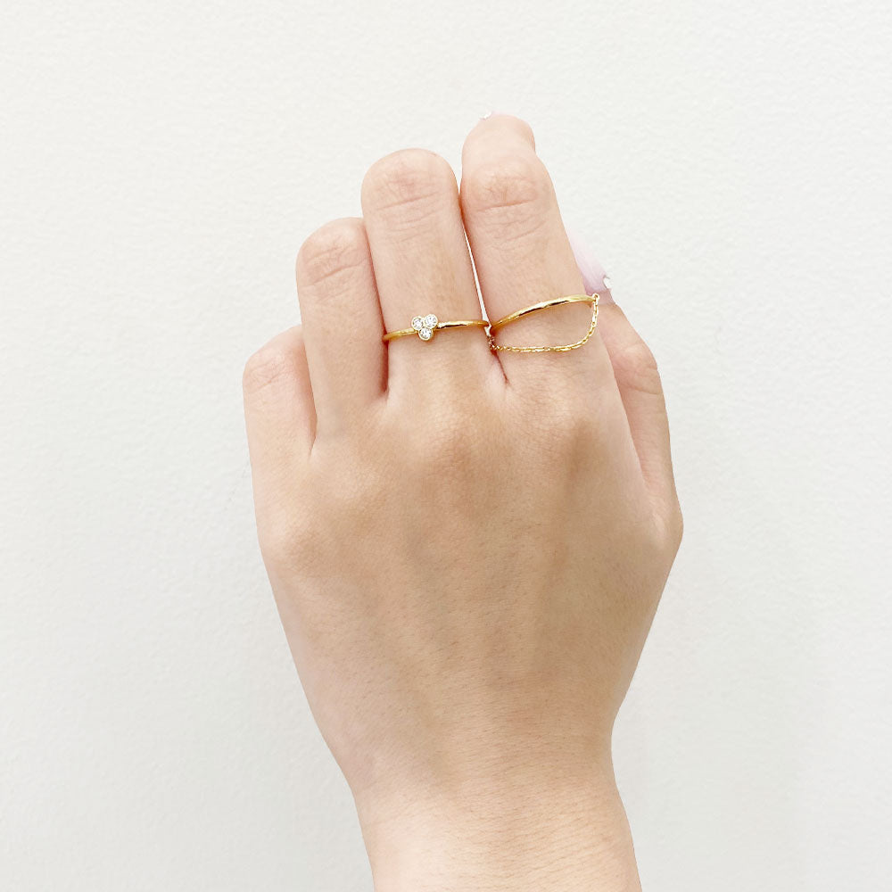 指が動くたびに、さらりと揺れるゴールドチェーンが可憐なリングは、見る人すべての注意をひきつける魅力を備えています。願い事のリングはもちろん、お持ちのリングなどと重ねてつけても、可愛らしさが引き立ちます。ピンキーリングにもおすすめです。
