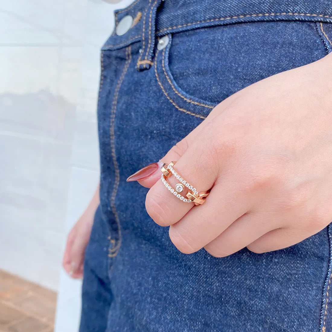 すべてが手作業、0.08カラットのブリリアントカットダイヤモンド3つを擁する18Kホワイトゴールドのパヴェリング。《ムーヴ》コレクションを象徴するこのリングは、身体の動きにつれてダイヤモンドがつねに揺れ、輝きを放ちます。過去、現在、未来の愛を象徴する3つのダイヤモンド。グラフィカルなデザインや洗練されたシルエットは、ダイヤモンドのある日常にしっくりなじむでしょう。