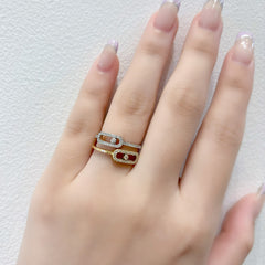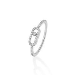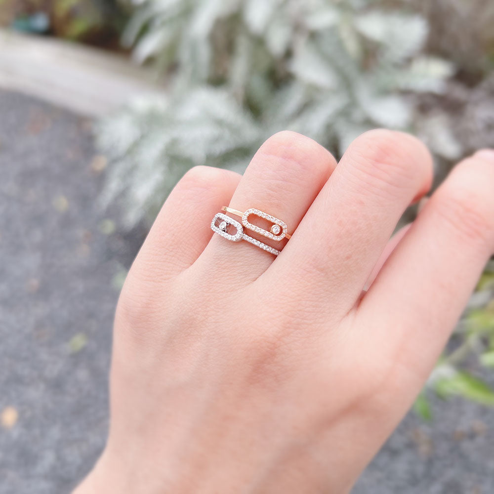 フレームの中でブリリアントカットの一粒ダイヤモンドが揺れる。これがメシカのアイコニックコレクション《ムーヴ》です。ミニマルで繊細なジュエリーは、片時も離れないパートナー。ひとつでも、また《ムーヴ ウノ》 ピンクゴールドリングと重ねてつけても。