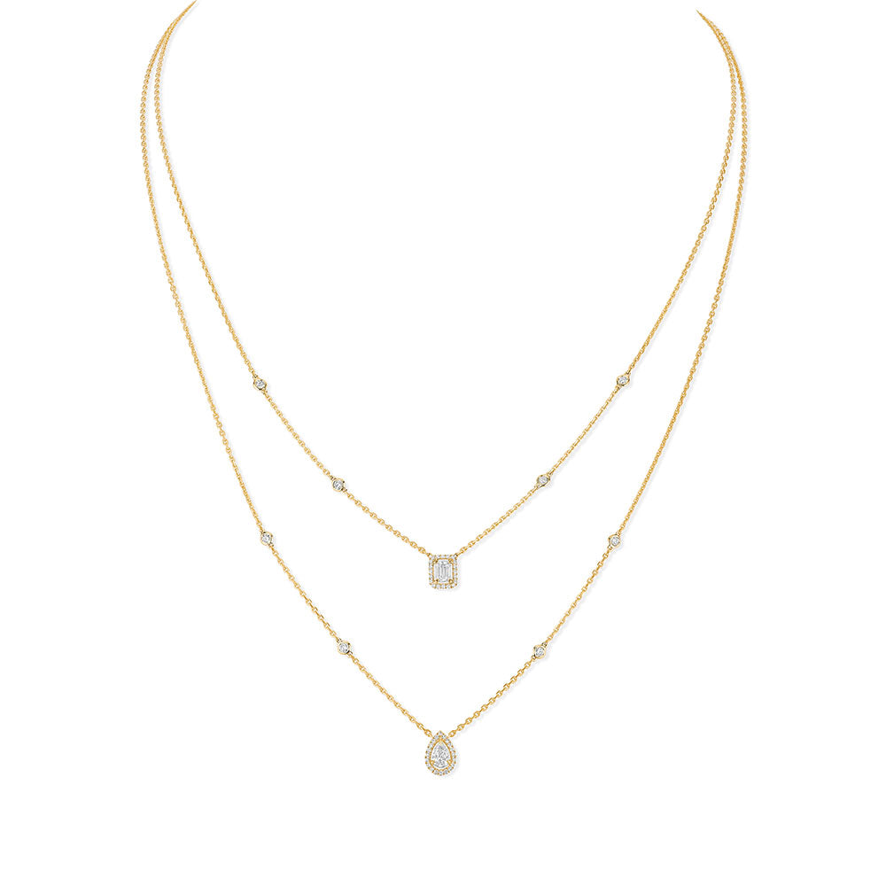 あらゆるフォルム、あらゆるカット、とりわけペアシェイプとエメラルドカットの間で響き合う光の魔法がダイヤモンドを讃える、《マイツイン》コレクション。18Kイエローゴールド&ダイヤモンド二連ネックレスは、2本のネックレスを重ねづけするトレンドに新たな解釈を加えたデザインです。