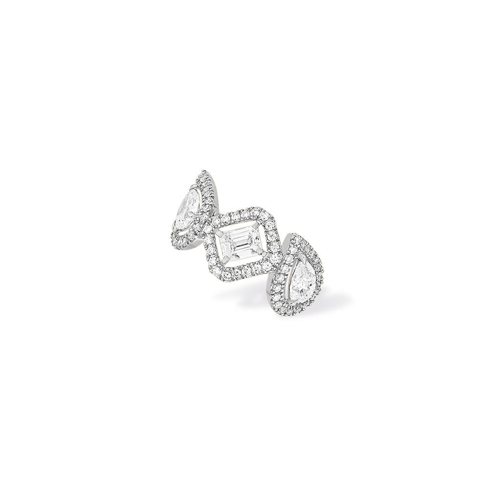 ゴールド&ダイヤモンドイヤリングはまちがいなく今年のトレンド。ただしシンプルでお行儀のよいクラシカルなゴールド&ダイヤモンドペアイヤリングには要注意。それよりも、アシンメトリーや目新しいつけ方がおすすめ!ちょっと型破りだけどチャーミングなこのトレンドを取り入れるのに、イヤークリップは最高。片耳だけのこのダイヤモンドモノイヤークリップは、アシンメトリー使いがチャーミング。ピアスの穴も不要。ゴールドのクリップを留めたら完成。《マイツイン》のペアシェイプダイヤモンドとエメラルドカットダイヤモンドのイヤークリップは洗練されたロックスタイル。耳の中ほどで留めるタイプです。