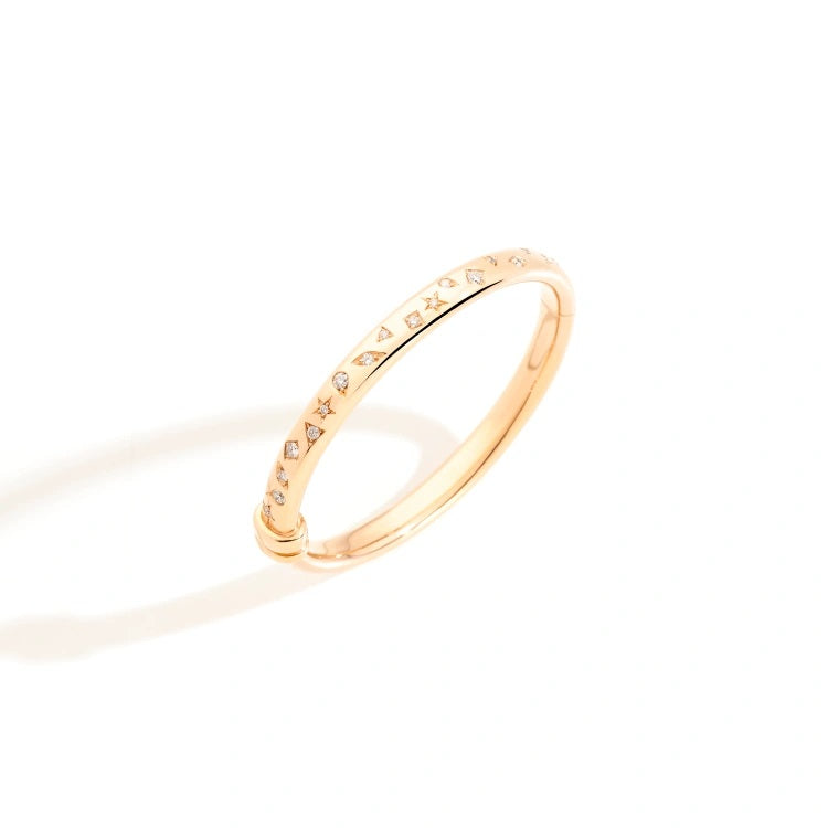 ゴールドジュエリーの曲線美が魅力のもう一つのコレクション、Iconica(イコニカ)は、ポメラートが誇る金細工の伝統へのオマージュです。職人の手でひとつひとつ創られるIconicaのジュエリーは、どれもがジュエリーをこよなく愛する方のための絶品です。意匠を凝らした最高級のセッティングが優美で開閉が簡単な新作Iconicaバングルは、ローズゴールドに手彫りのダイヤモンドをポメラートの星形、三角、しずく形、ダイヤ形、正方形に石留めしたものです。