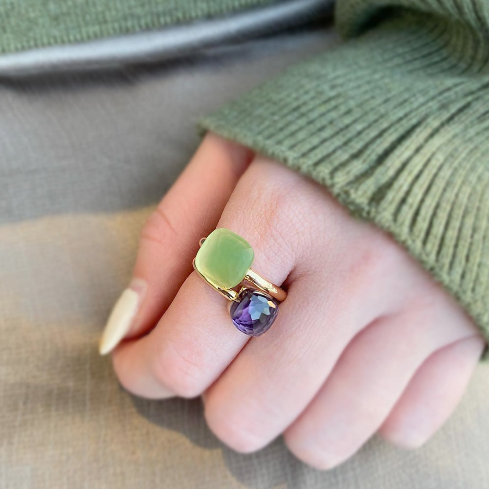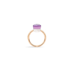 ブランドを代表するアイコンリングの最小バージョン、ヌードプチ。カラーバリエーションが豊富な、コンパクトな「ヌード」の宝石をあしらったより繊細なデザインです。 異なるサイズの宝石との組み合わせをお楽しみください。カットされたアメジストをあしらった、ローズゴールドのリング”ヌード・プチ”です。マウント部はホワイトゴールドです。