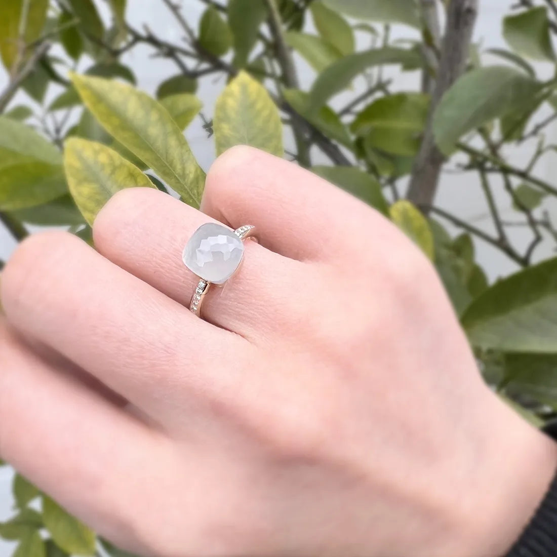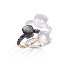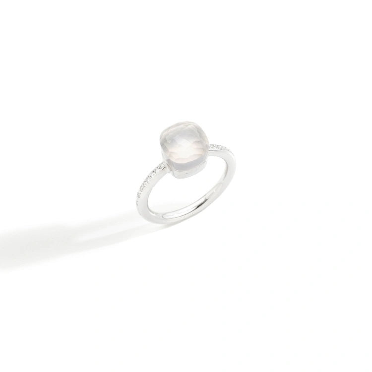 ジェムストーンが内に秘める美しさ。その表現方法を追求する「ヌード ミルキー」には、半透明のクリーミーホワイトクオーツがあしらわれています。ホワイトゴールドにダイヤモンドを嵌めたプチリング。 ポメラート初の試みとして、従来のホワイトゴールドよりも明るいカラーで長持ちするマンガン入りの新しいホワイトゴールド合金を使用しています。