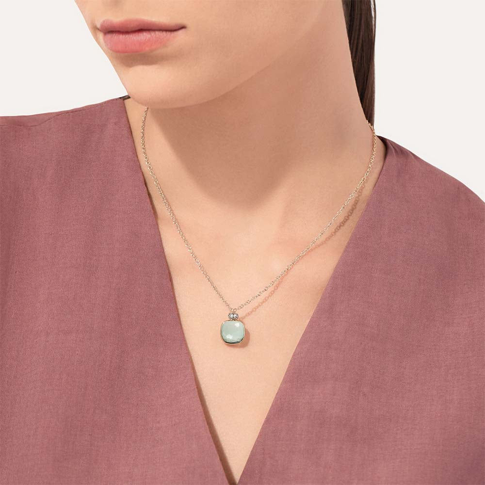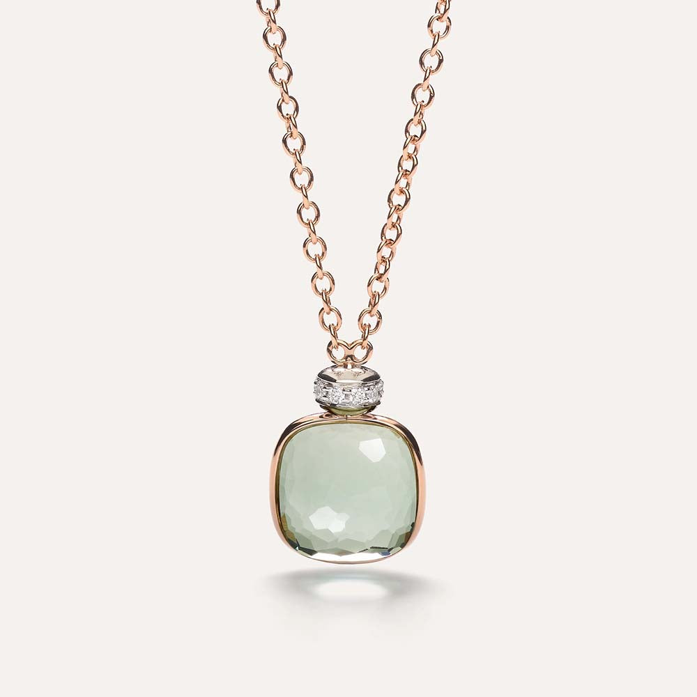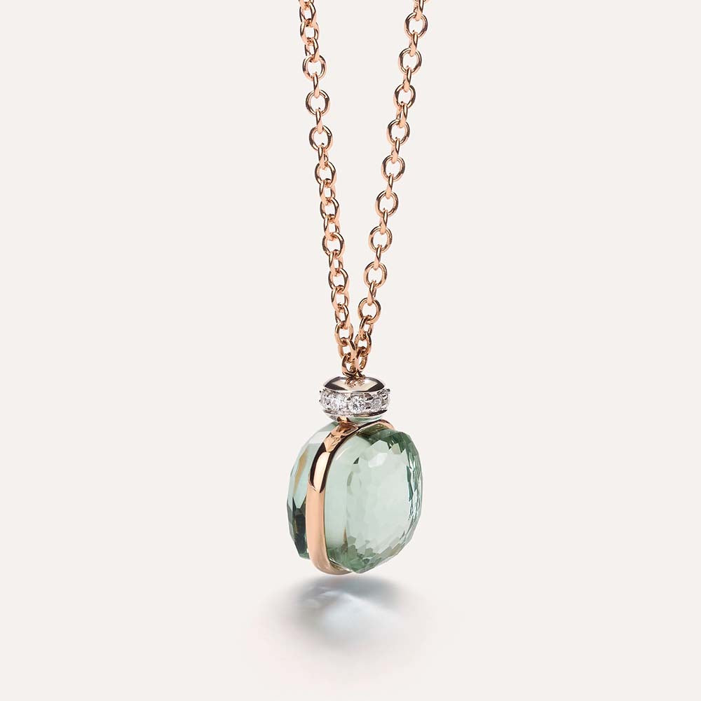 「ヌード」からプラシオライトをあしらった魅力的なローズゴールドのペンダントを発表。ストーンをゴールドのバンドで囲むことで光が増して輝きます。さらにポメラート独自のクレシドラカットにより今までにないカラーエクスペリエンスが生まれます。煌めくジュエリーを仕上げているのは、ストーン上部にあしらわれたホワイトダイヤモンドです。
