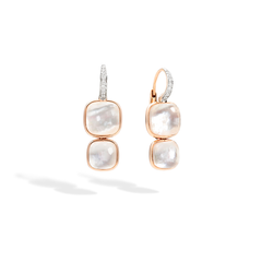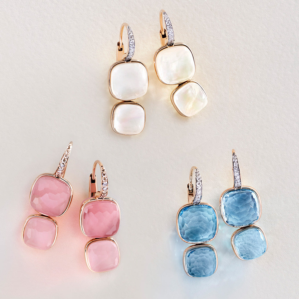 「ヌード」にホワイトトパーズと控えめに輝くマザーオブパールを組み合わせた魅惑的なダブルドロップイヤリングが登場しました。メゾン独自のクレシドラカットによって、2種類のストーンをシームレスにつなぎ、中央をゴールドのバンドで囲んでいます。それぞれのストーンのファセットの輝きが倍になり、深みあるカラーとそのニュアンスを楽しむことができます。上部にダイヤモンドがセッティングされ光を放ちます。