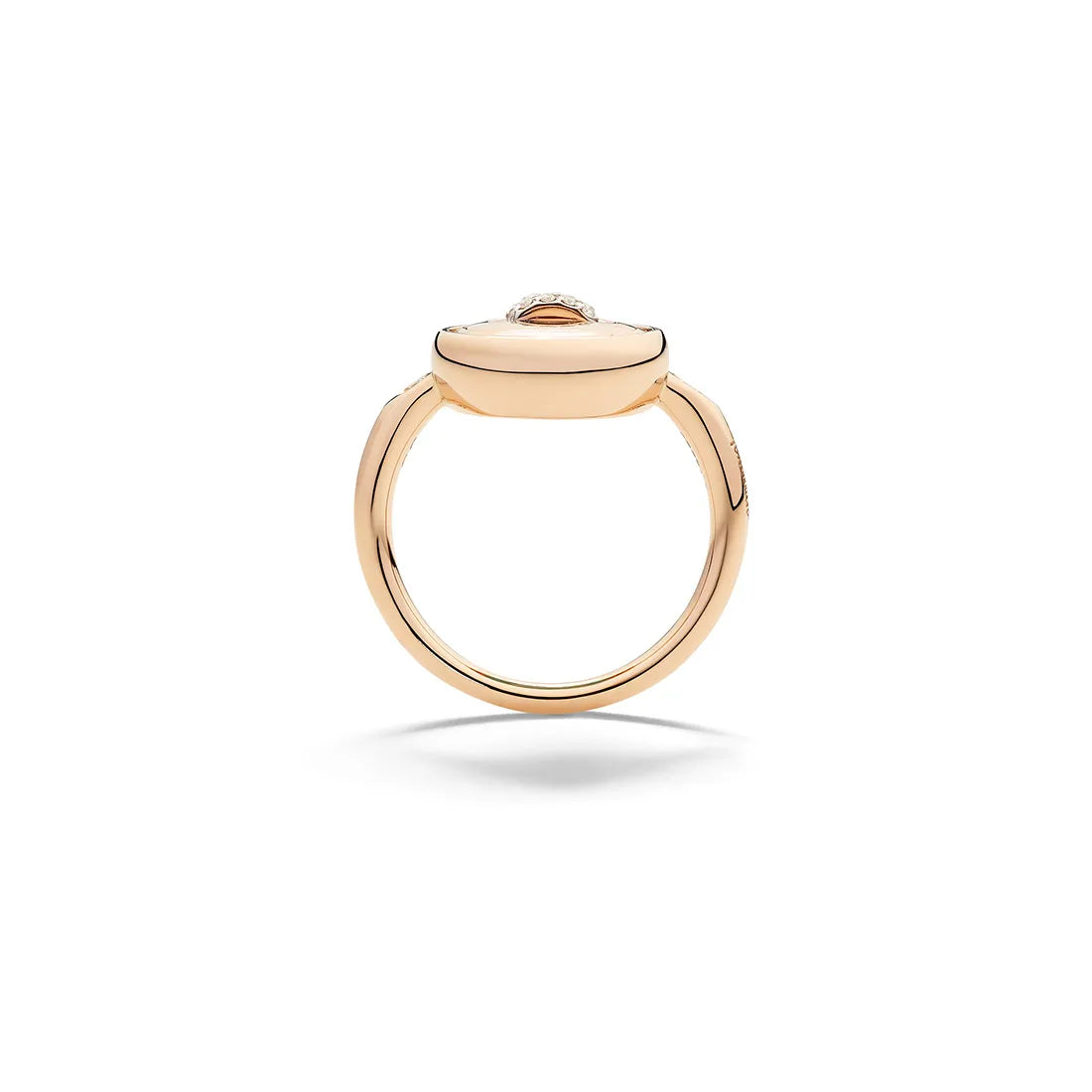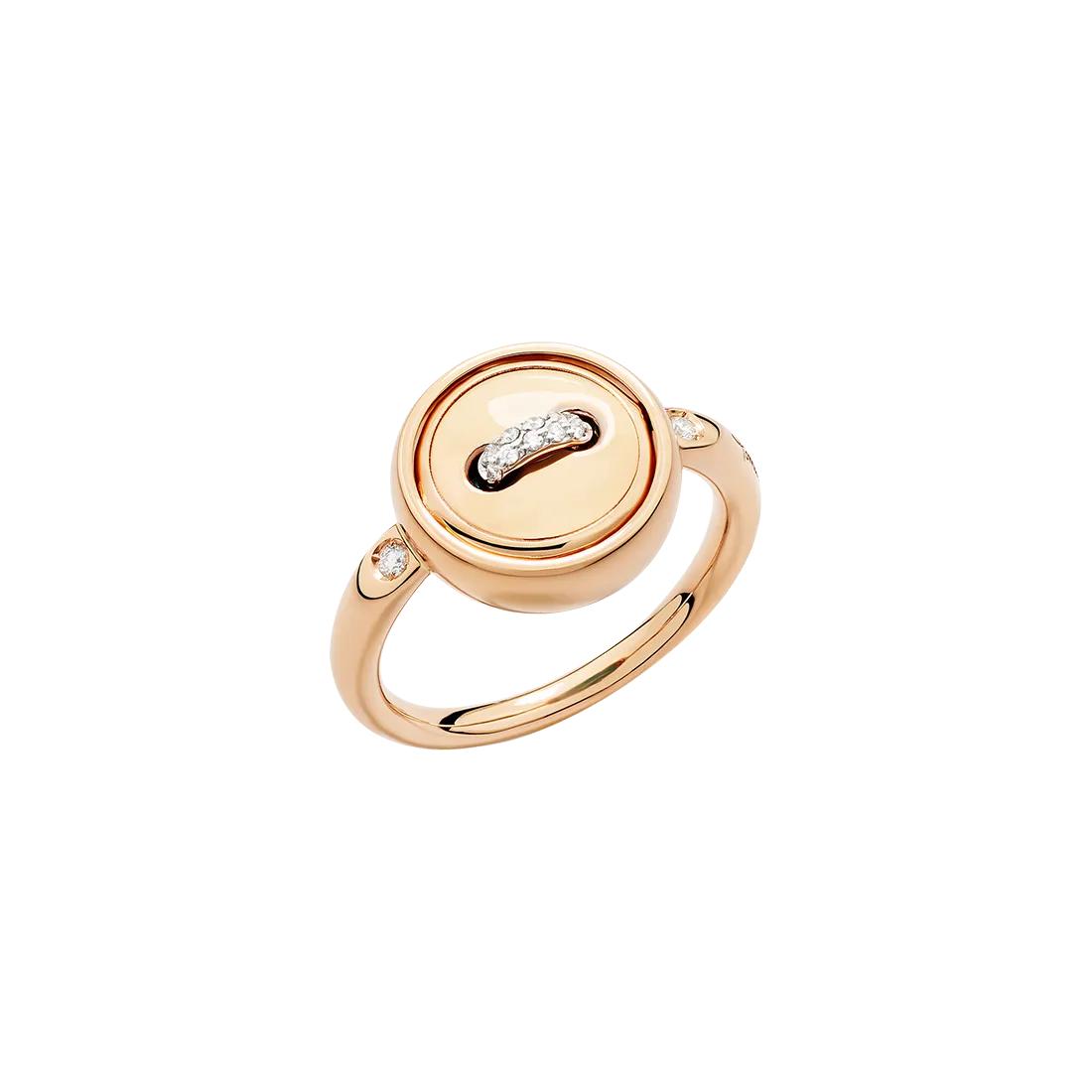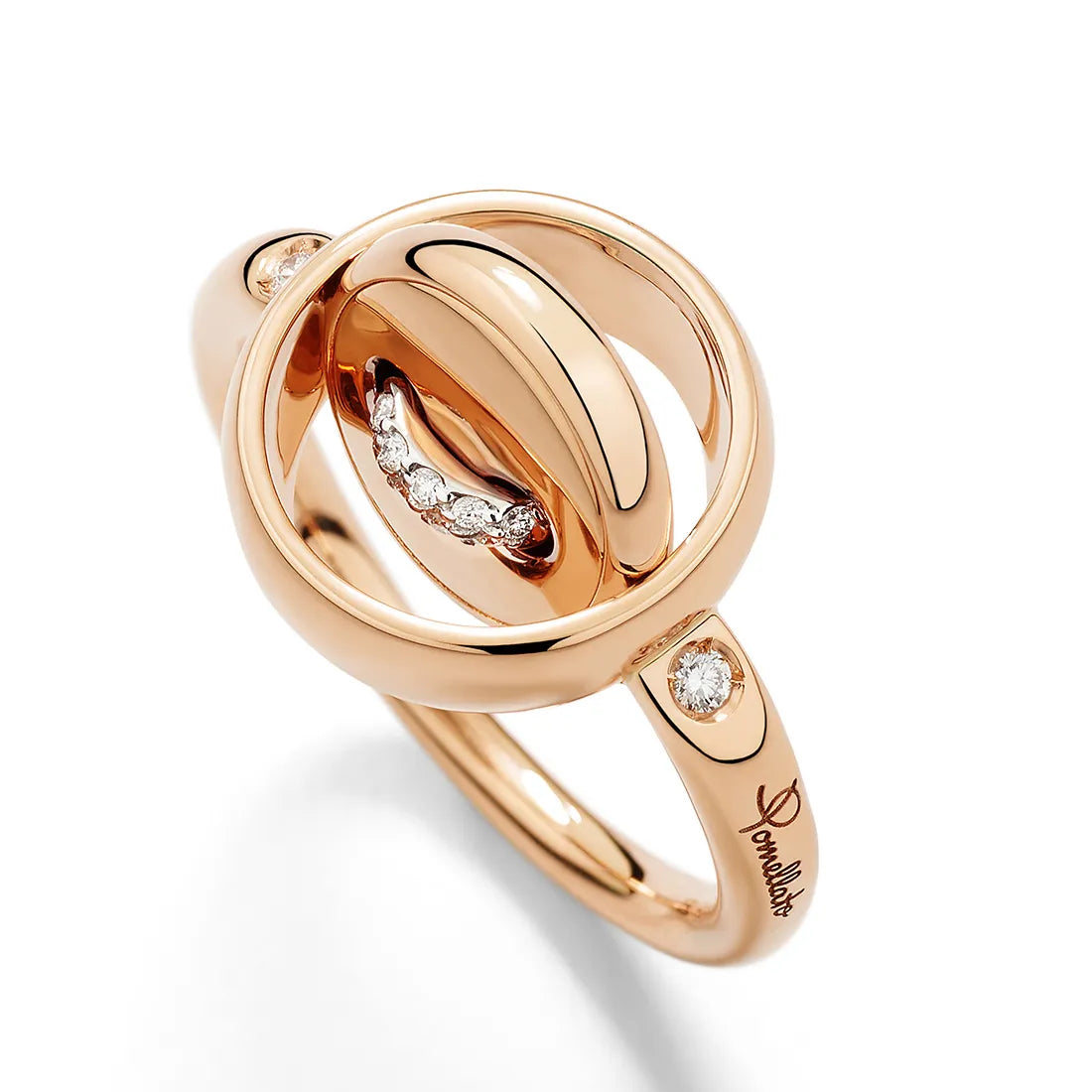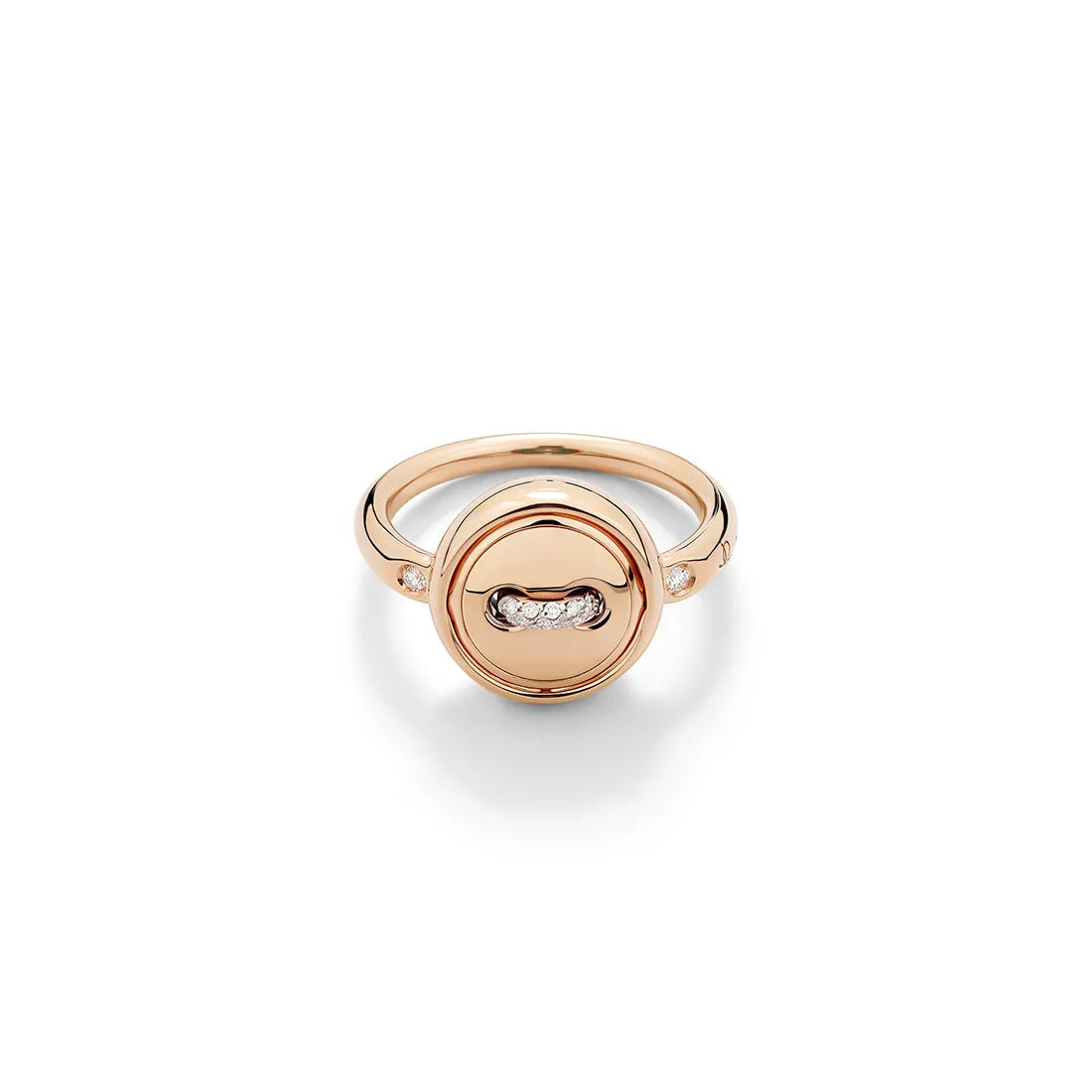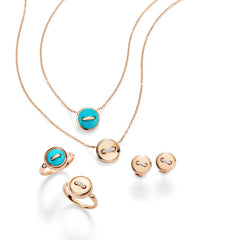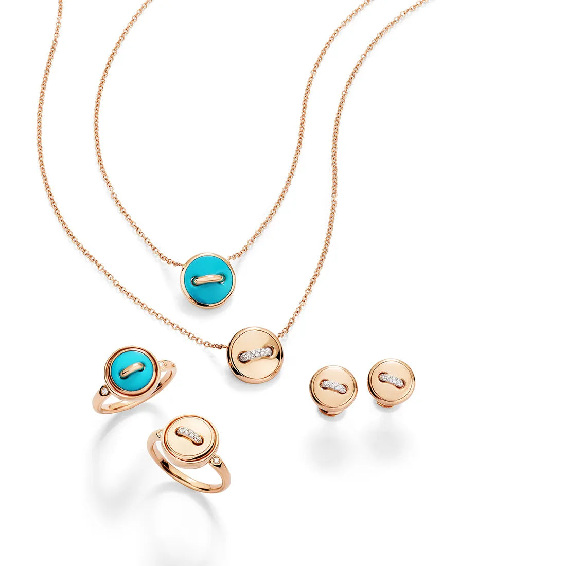 ポムポム ドット コレクションは、1974年のボタンからインスパイアされたゴールドネックレスを原点に、ポメラートの伝統を現代的に解釈しています。リバーシブルで仕立てられた各作品には2つの異なる表情が宿り、歴史あるボタンのモチーフを、つながりと守護の象徴へと昇華させています。この現代的なデザインは、遊び心と多様性を備えたジュエリーを通じて、機能性と象徴性の両方を称えています。 この新作リバーシブルリングは職人技の傑作で、片面にダイヤモンドをセッティングしたスレッドで装飾されたローズゴールドの洗練された表面を、もう片面には裏返すことでローズゴールドのスレッドが映えるピュアなターコイズの表面を見せます。このターコイズは、天然石としては稀少な、インクルージョンのない特別な品質の石が選び抜かれています。ターコイズとローズゴールド、そしてダイヤモンドの組み合わせは、ポメラートならではの多様性と宝石への卓越した専門性を反映した、2つの異なるスタイルを提案しています。