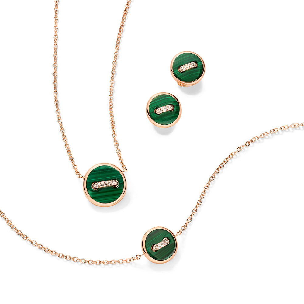 | 素材 | K18ローズゴールド、マラカイト2個(約3カラット)とホワイトダイヤモンド20粒(約0.07カラット) |