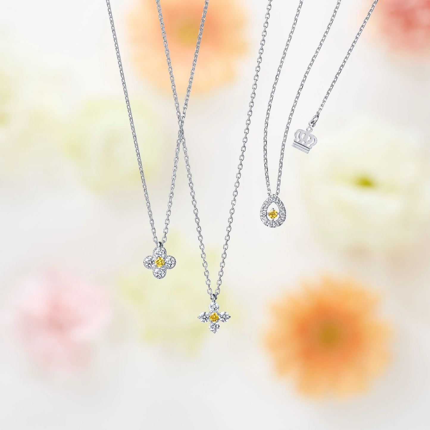 ”花の国オランダ”の美しい風景と咲き誇る花々を連想させるフラワーモチーフのペンダント。暖かい印象を与えるセンターのカラーダイヤモンドと周りを飾る白く透明感のあるダイヤモンドの色のコントラストが鮮やかな輝きを放ちます。滑らかな曲線を描くエレガントなデザイン、白く美しいティアドロップの中に際立つカラーダイヤモンドの煌めきが胸元を一層華やかに彩ります。