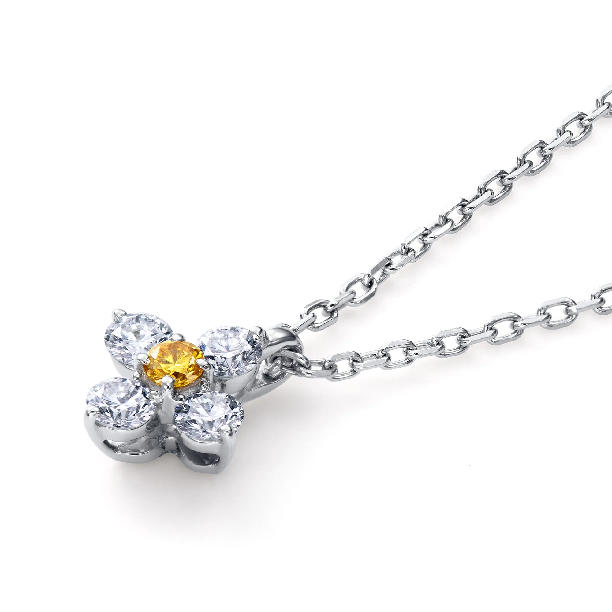 ”花の国オランダ”の美しい風景と咲き誇る花々を連想させるフラワーモチーフのペンダント。暖かい印象を与えるセンターのカラーダイヤモンドと周りを飾る白く透明感のあるダイヤモンドの色のコントラストが鮮やかな輝きを放ちます。繊細なあしらいのダイヤモンドセッティングにより、それぞれのカラーが強く共鳴し合い、胸元を一層華やかに彩ります。