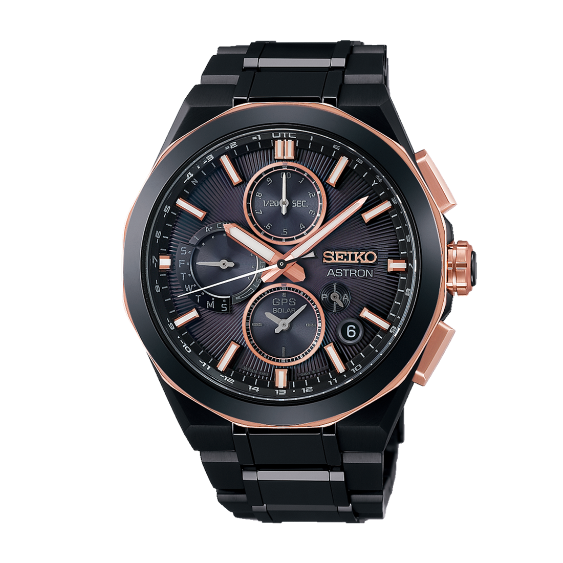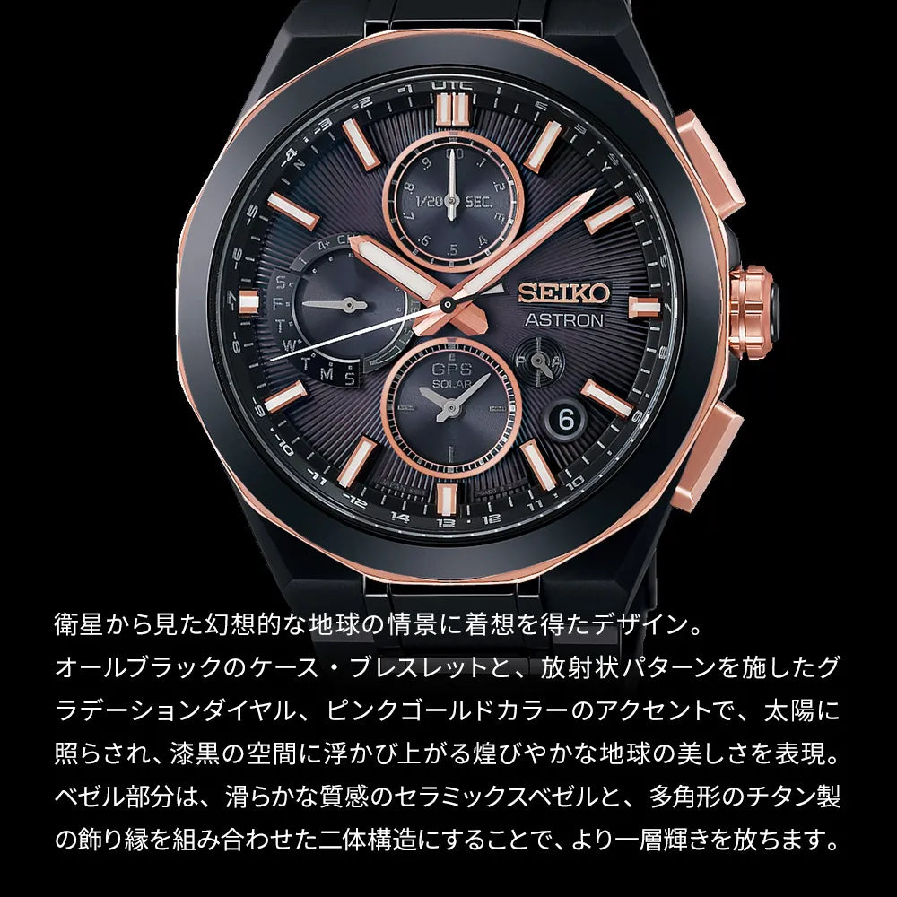 本作のデザインは、衛星から見た幻想的な地球の情景に着想を得ています。オールブラックのケース・ブレスレットと、放射状パターンを施したグラデーションダイヤル、ピンクゴールドカラーのアクセントで、太陽に照らされ、漆黒の空間に浮かび上がる煌びやかな地球の美しさを表現しました。ベゼル部分は、滑らかな質感のセラミックスベゼルと、多角形のチタン製の飾り縁を組み合わせた二体構造にすることで、より一層輝きを放つデザインとなっています。