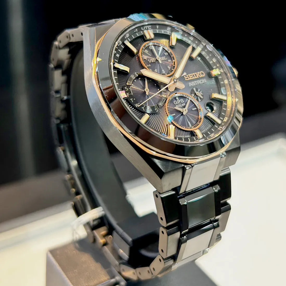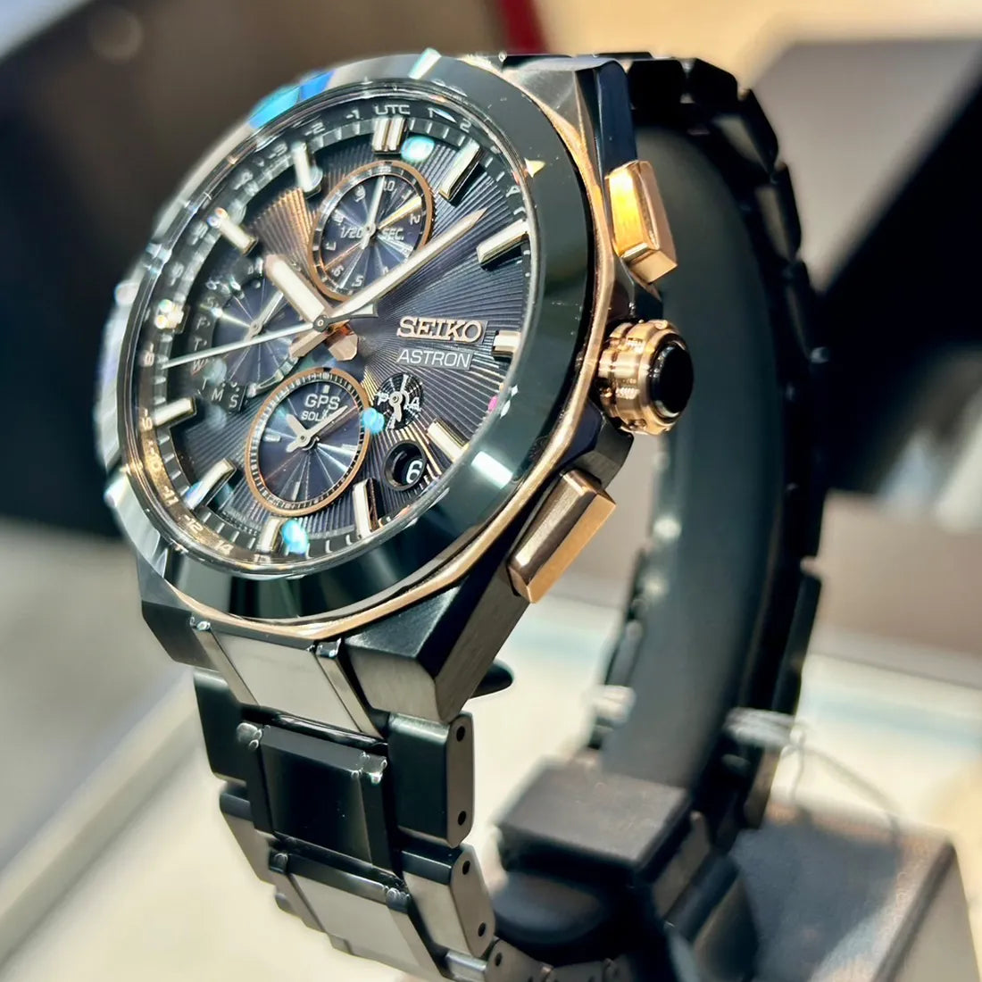 また、艶やかな光沢を放つセラミックスを、ブレスレットの中央の列と、りゅうずの先端に採用している点も、限定モデルならではの特別仕様です。