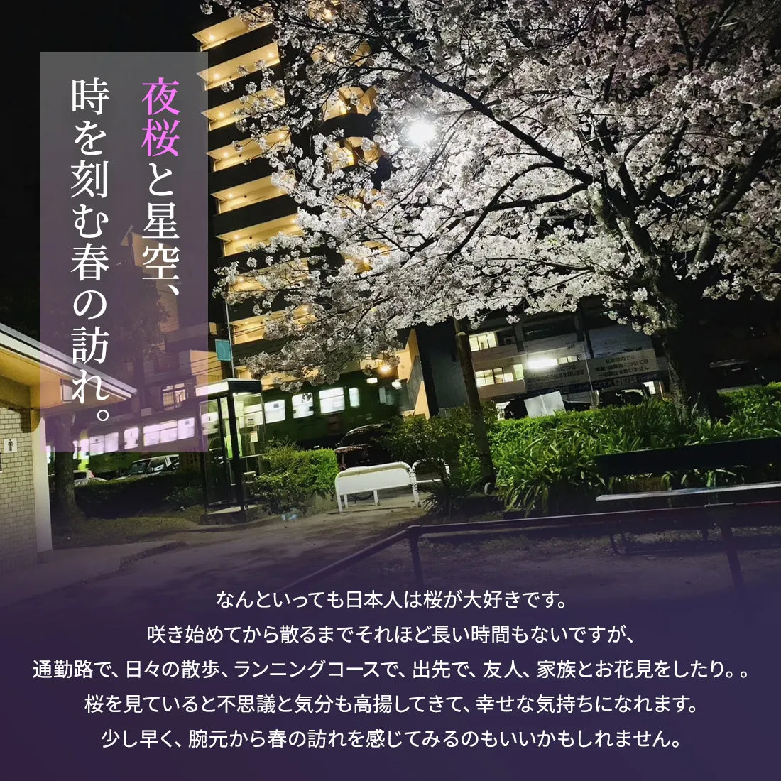 星空と風に舞う夜の桜が織りなす美しい情景を、オールブラックカラーのケース・ブレスレットと、パープルカラーをベースとしたラメ入りのグラデーションダイヤルで表現しました。