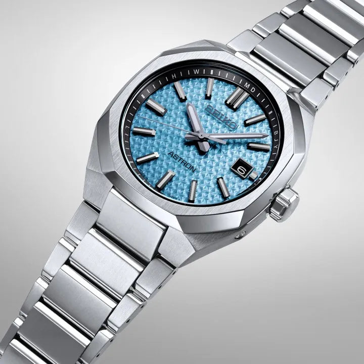 広大な夜空に瞬く、星々の力強く美しい輝きを、ダイヤルの透明感あるライトブルーと、星をモチーフとした、見る角度によって表情が変わる型打ちパターンで表現しています。