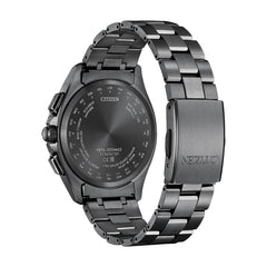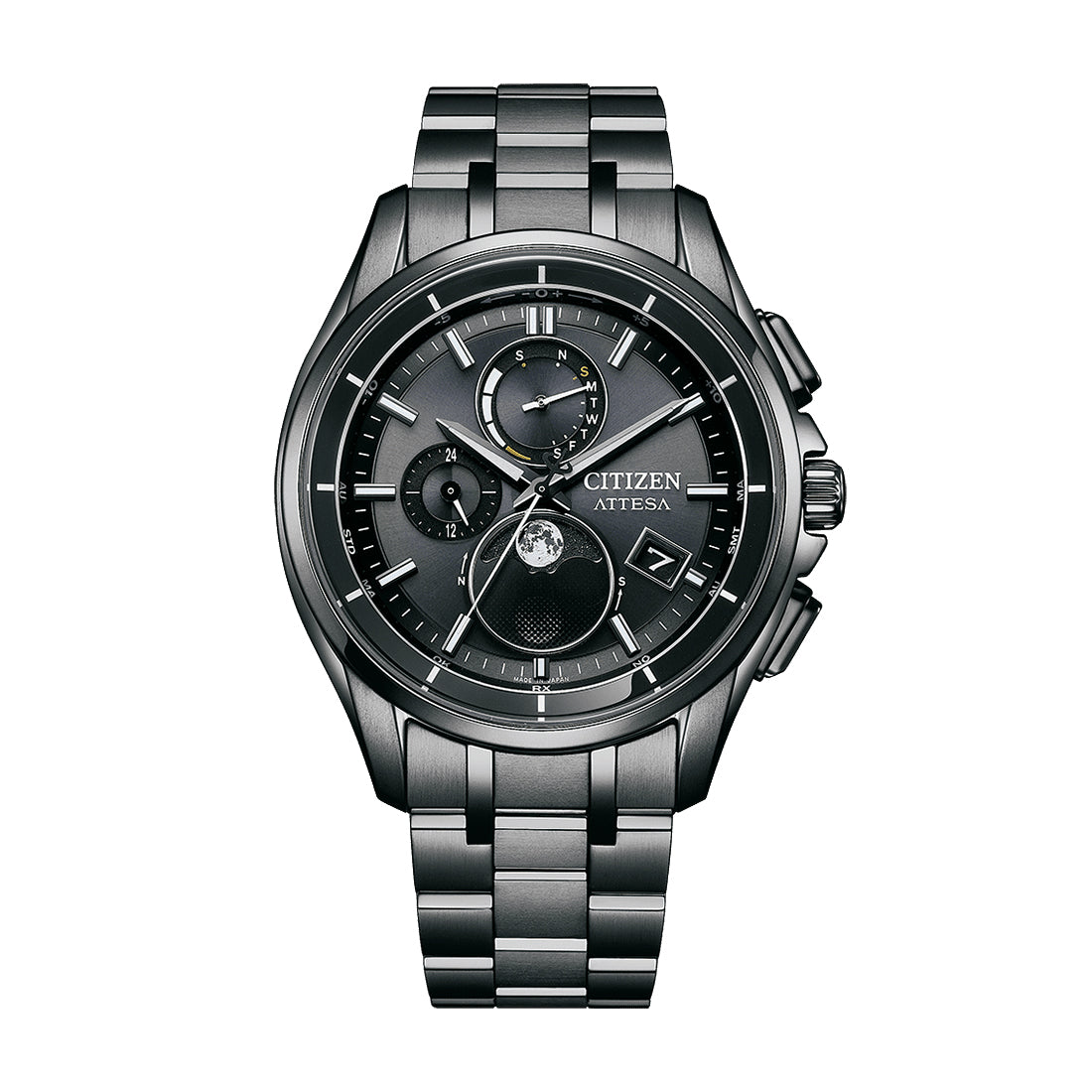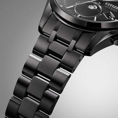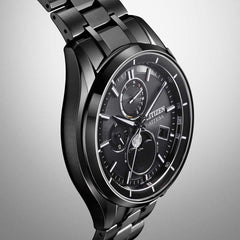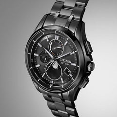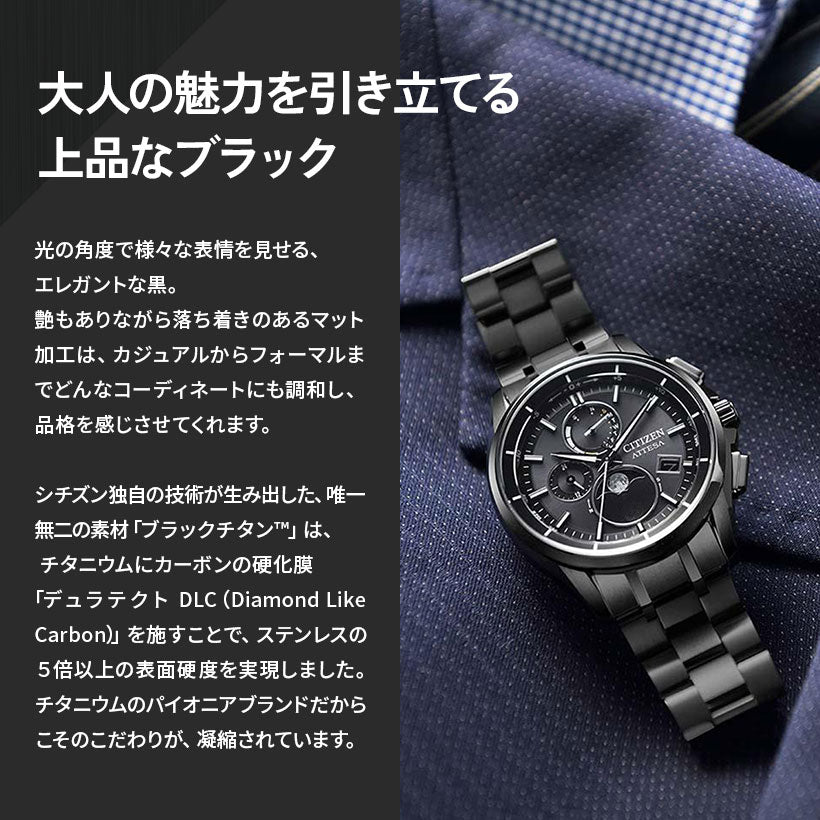 ケース形状はスポーティでありながら、のびやかなラグがエレガントなデザイン。多針ながらもスッキリとしたダイヤルレイアウトと、深いブラックの文字板が印象的です。*2023年8月現在。シチズン時計調べ。