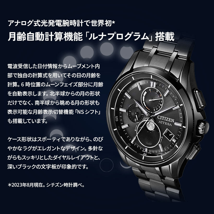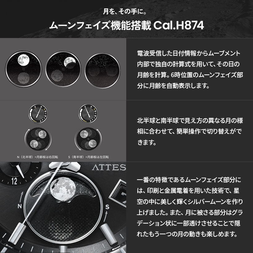 電波受信した日付情報からムーブメント内部で独自の計算式を用いてその日の月齢を計算。6 時位置のムーンフェイズ部分に月齢を自動表示します。北半球からの月の形状だけでなく、南半球から眺める月の形状も表示可能な月齢表示切替機能「NS シフト」も搭載しています。