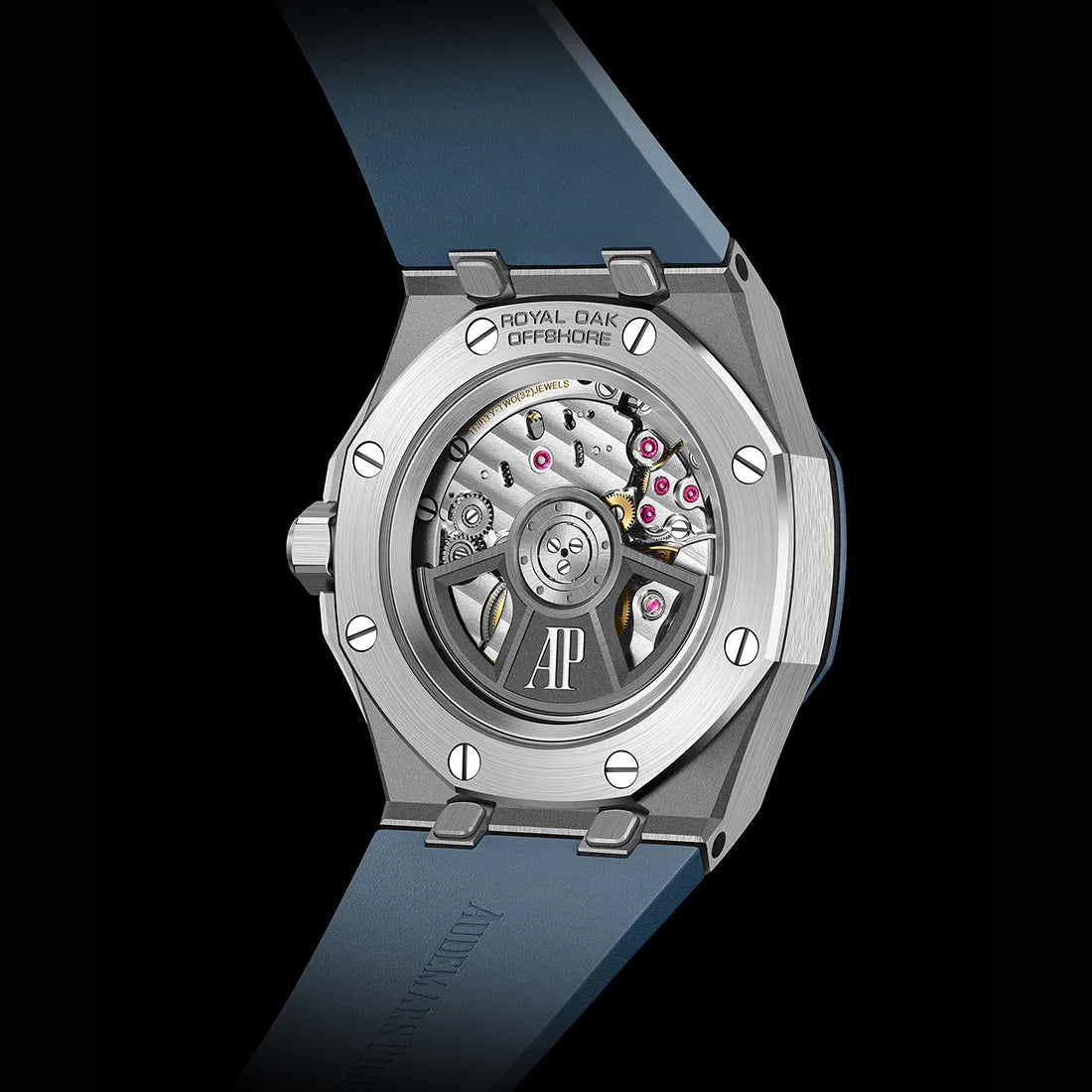 ステンレススチールケース、ブルーラバーカバーのベゼル、反射防止加工のサファイアクリスタルとケースバック 文字盤: メガ タペストリー模様のスモークブルーダイヤル、蓄光処理を施したホワイトゴールドのアワーマーカーとロイヤル オーク針、ブルーインナーベゼル ブレスレット: ブルーラバーストラップ、ステンレススティールのピンバックル。ブラックラバーストラップが付属 |