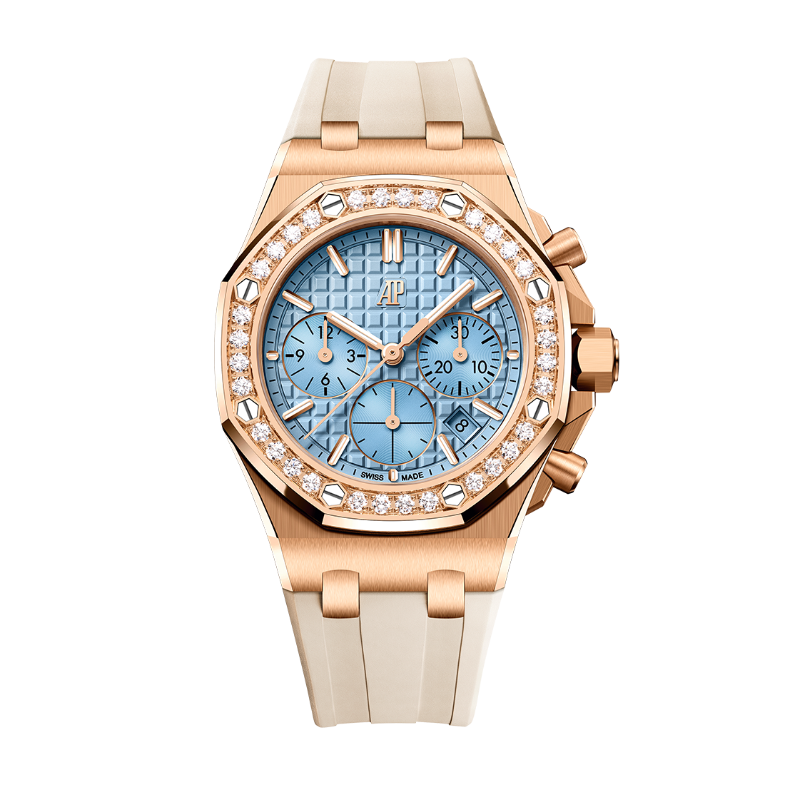 18Kピンクゴールドケース、ベゼルにブリリアントカットダイヤモンドをセット、反射防止加工サファイアクリスタル、ネジ込み式リューズ。 文字盤: レディ タペストリー模様のライトブルーダイヤル、ブルーカウンター、蓄光処理を施したピンクゴールドのアプライドアワーマーカーとロイヤルオーク針。 ブレスレット: 交換可能のベージュラバーストラップ、18Kピンクゴールドピンバックル。ライトブルーラバーストラップが付属。 |