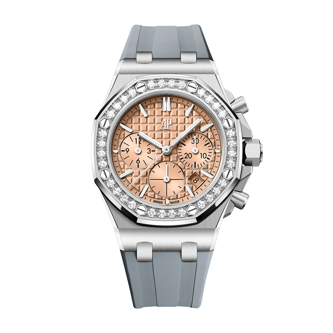 ステンレススティールケース、ステンレススティールベゼルにブリリアントカットダイヤモンドをセット、反射防止加工サファイアクリスタル、ネジ込み式リューズ。 文字盤: 「レディ タペストリー」模様のサーモンダイヤル、サーモンカウンター、蓄光処理を施したホワイトゴールドのアプライドアワーマーカーとロイヤルオーク針。 ブレスレット: グレーラバーストラップ、ステンレススチールピンバックル。ダークグレーラバーストラップが付属。 |