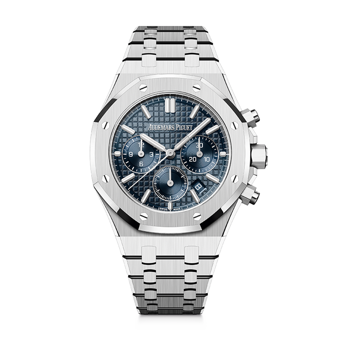 ステンレススティールケース、反射防止加工サファイアクリスタル、ネジ込み式リューズ。 文字盤: 「グランドタペストリー」模様の「ナイトブルー、クラウド50」ダイヤル、「ナイトブルー、クラウド50」カウンター、蓄光処理を施したホワイトゴールドのアプライドアワーマーカーとロイヤルオーク針。 ブレスレット: ステンレススティールブレスレット、APフォールディングバックル。 |