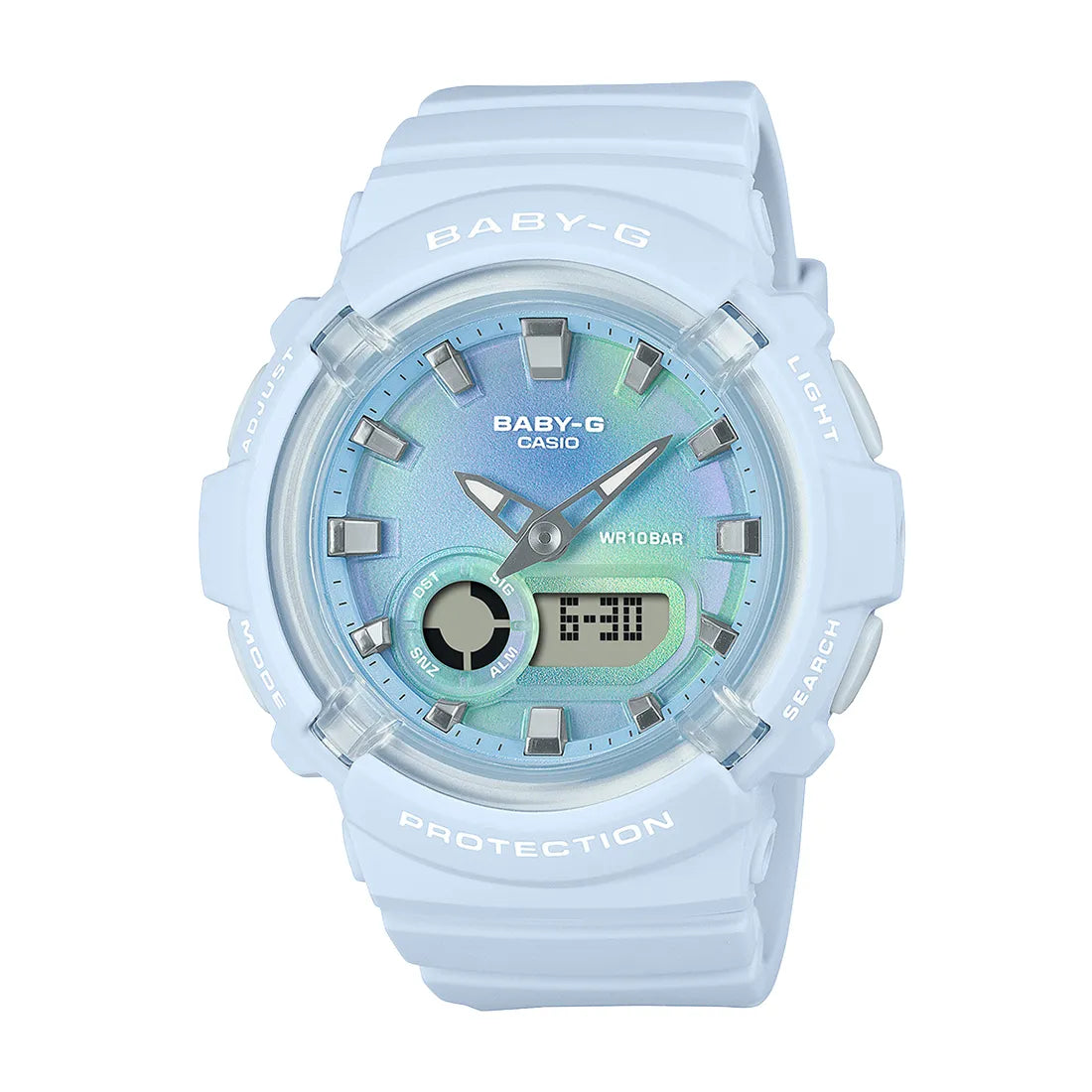 アクティブな女性に向けた耐衝撃・カジュアルウオッチBABY- Gから、タイダイデザインがアクセントのモデルです。丸みのあるシルエットと多層構造ケースが特徴のBGA-280をベースに、パステルブルー、ホワイトの2色をご用意。柔らかなタイダイ柄と蒸着仕上げのインデックスで手元を華やかに演出します。