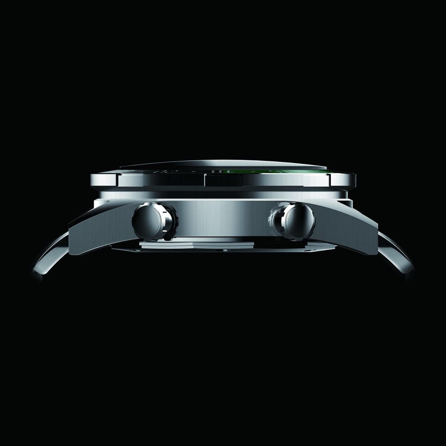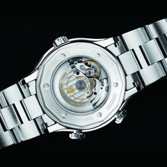 国内では未展開だった「ロードマスター」が第6番目のシリーズとして、遂に日本に上陸。 本機のGMT機能はケースサイド10時位置のプッシュボタンを押すと24時間針が1時間進み、8時位置のプッシュボタンを押すと1時間戻る仕組みになっており、容易にGMT針の時刻設定が可能。また、青黒、緑黒、茶黒で昼夜が分けられたセラミック・トップの逆回転防止機能付ベゼルを利用すれば第3時間帯まで時刻を読み取ることができます。