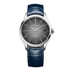 ビジネススタイルに華やかさを加えるグレーグラデーションダイヤルのクリフトン ボーマティック。ステンレススティールのブレスレットは日本の高温多湿な気候でも快適にお使いいただくことができます。時針、分針に加え、3時位置にデイト表示を配し、5日間のパワーリザーブ、1500ガウスの耐磁を備え、ユーザーメリットを追求したモデルです。センターのホワイトクロスラインは、COSC(スイス公認クロノメーター検定)取得の証でもあります。薄型のケースなので袖口にかかることなくお使いいただけます。