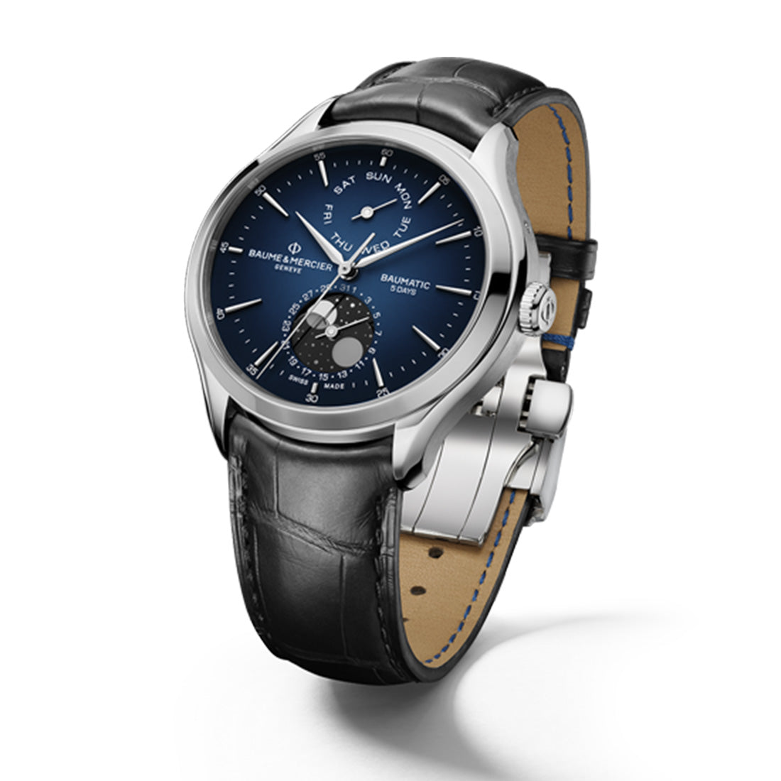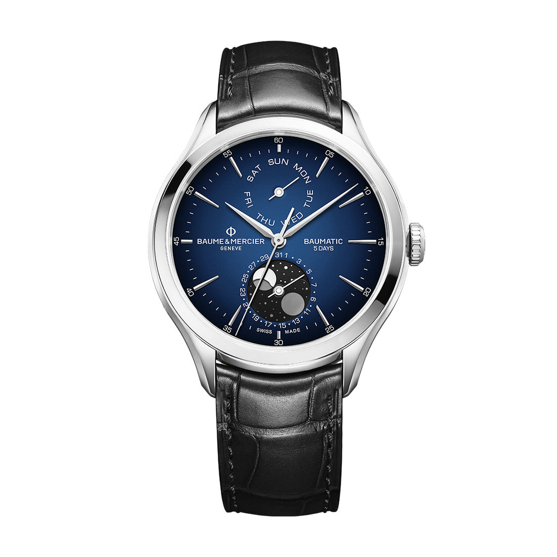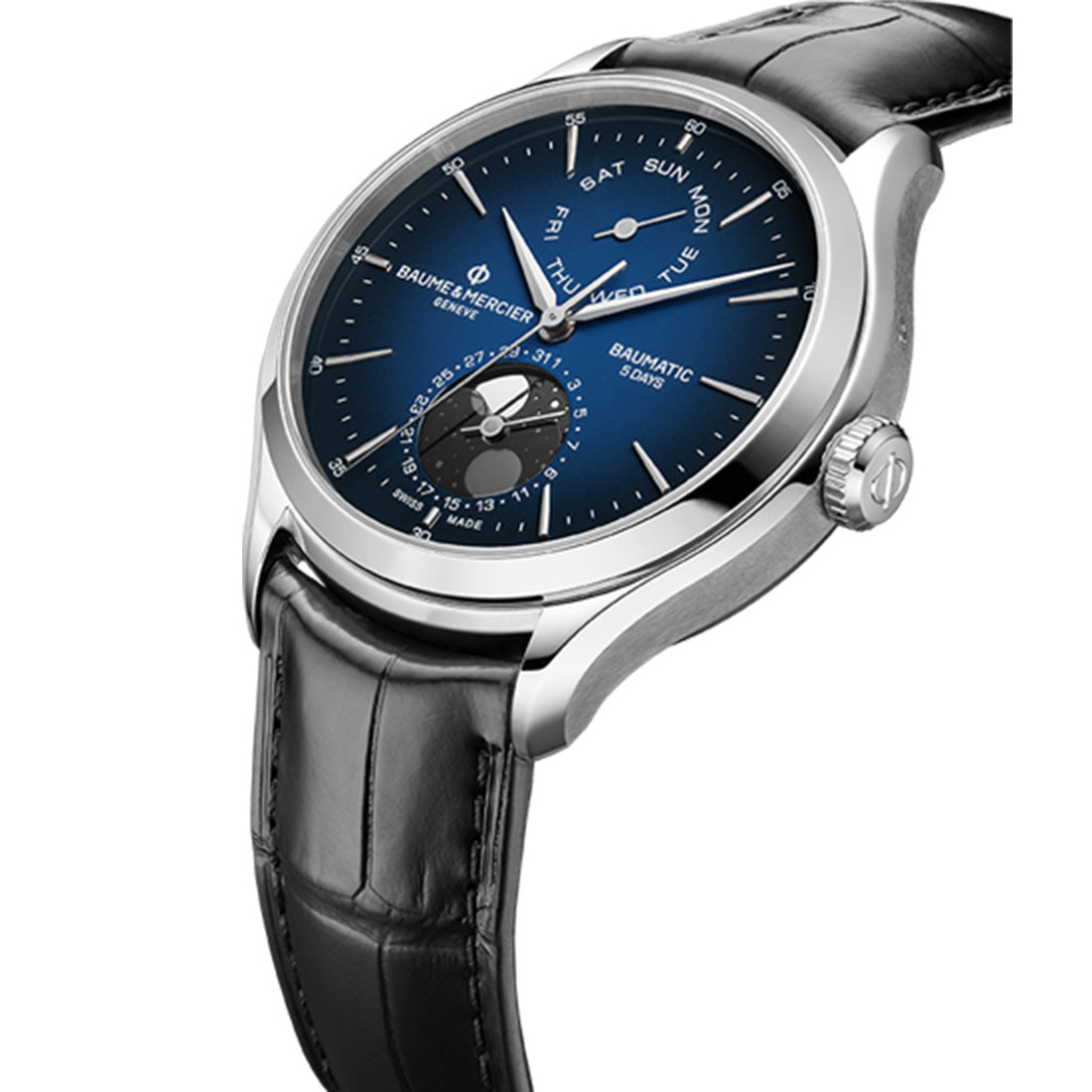 オリジナルのボーマティック ムーブメントに、月のサイクルが加わりました。このモデルはすでに複数のバージョンを提案していますが、初めてブルーのグラデーション・ラッカーダイヤルを備え、透明なグレーサファイアクリスタルを通して6時位置の星空がご覧いただけます。ポリッシュ・ブラックラッカー仕上げロジウム加工の月のディスクがその美しさを輝かせています。曜日は、12時位置の窓に表示され、6時位置には日付が表示されます。細い台形型インデックスは、ロジウム加工、リベット留めされ、ダイヤルを際立たせます。先端が細くなったアルファ型針は、ファセットが施されロジウム加工がされています。