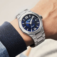12角形 ポリッシュ・サテン仕上げステンレススティール サンレイ・サテン&ポリッシュ仕上げステンレススティールベゼル 4本のサンドブラストビス 4本のビスで固定したオープンケースバッグ ファイのロゴをエンボス加工した8角形リューズ 文字盤: スモークブルーサファイアガラス、ウェーブ装飾 スーパールミノバ(C1、ブルーで発光)加工されたリベット式 ローマ数字インデックス ファセット仕上げのロジウム加工針 ブレスレット: ポリッシュサテン仕上げ3連ステンレススティールブレスレット インターチェンジャブル トリプルフォールディングバックル |