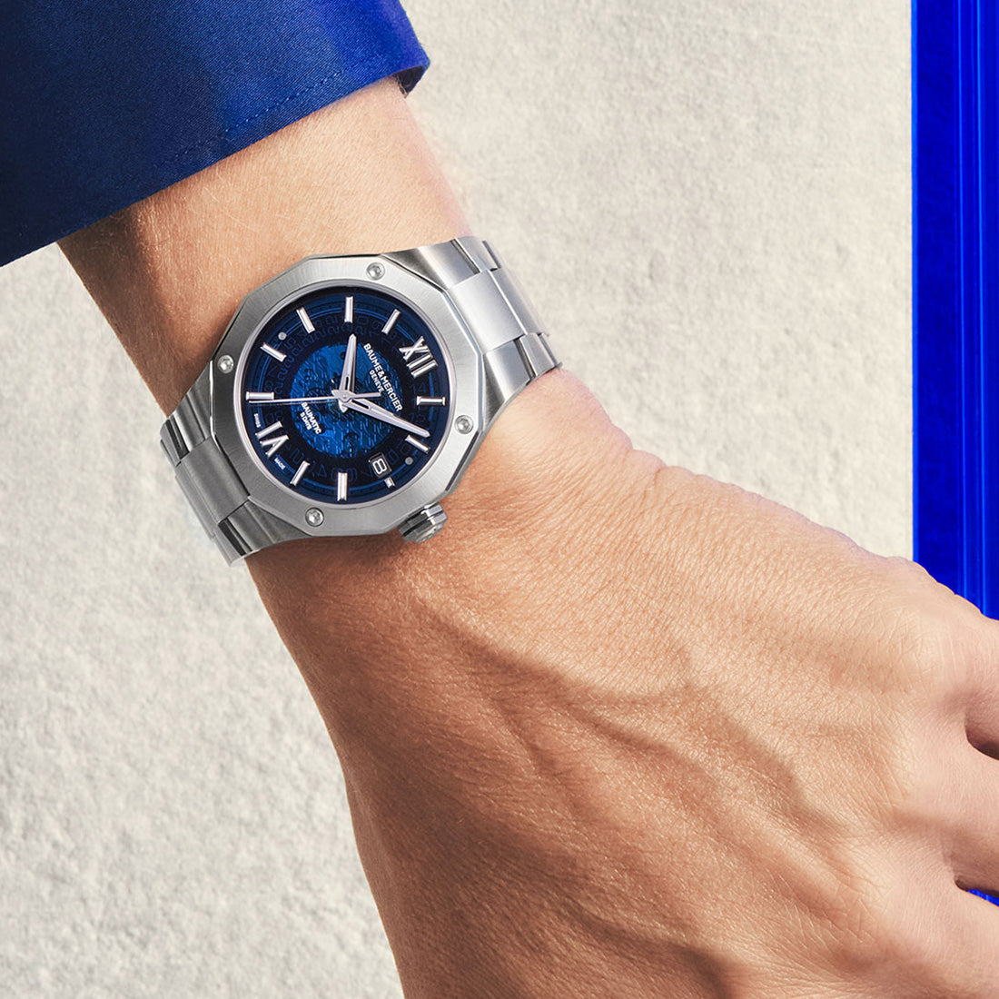 1973年誕生、12角形のベゼルが特徴的な「リビエラ」が第5世代となって登場。ダイヤルに表示された12の時間を反映した12角形のベゼルがユニークなボーム&メルシエのフラッグシップモデル。山、海、水しぶきをイメージした独特のウェーブ装飾がダイヤル上で華やかに表現されています。力強いシルエット、一風変わったエレガンスをお楽しみいただけます。角度や光で半透明のダイヤル上から中のムーブメントの見え方が異なり、いつ見ても楽しめるタイムピースです。また、5日間パワーリザーブが魅力の自社ムーブメント”ボーマティック”が搭載され、ユーザーメリットを追求した最上級モデルは実用性とデザイン性を併せ持っています。