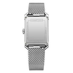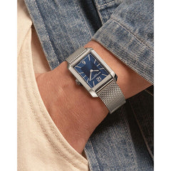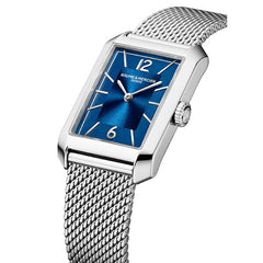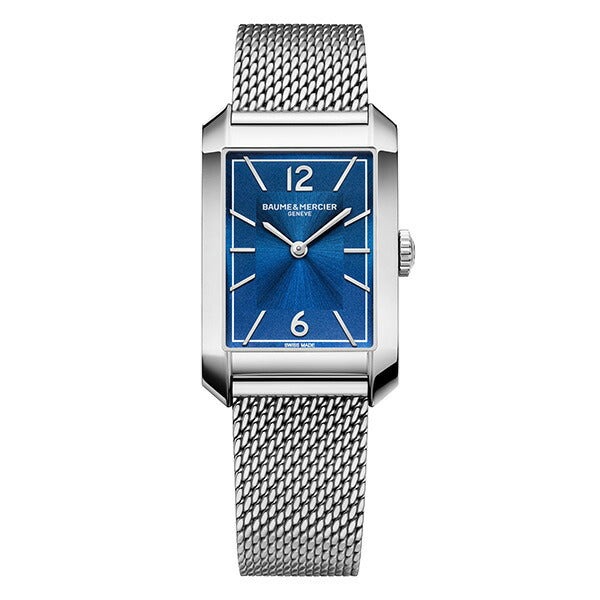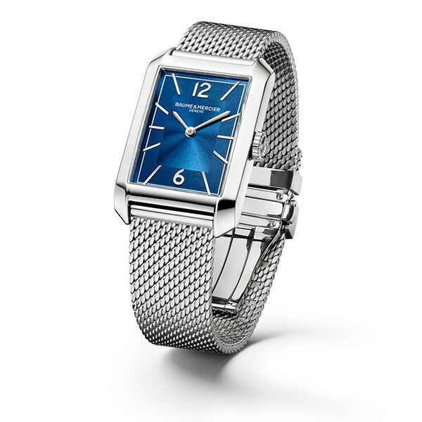ポリッシュ仕上げステンレススティール フルケースバック 文字盤: オパーリン&サンレイ・サテン仕上げブルー ロジウム加工リベット式アラビア数字インデックス ロジウム加工スウォード針 ホワイトミニッツライン ブレスレット: ポリッシュ仕上げステンレススティールミラネーゼ インターチェンジャブル ダブルフォールディングクラスプ |